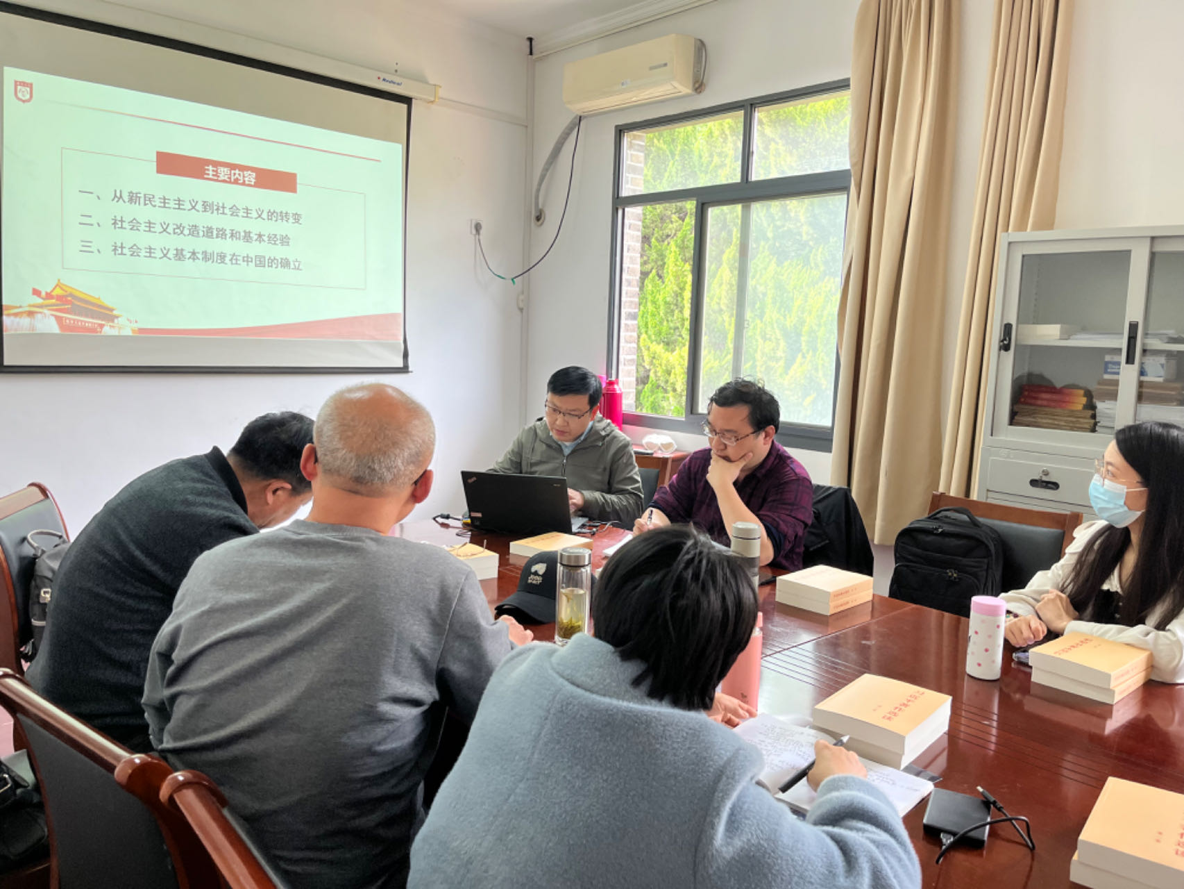 4月26日,教研室开展备课活动,由陈诚主任主持。备课会首先由高志军老师讲解,内容为新民主主义社会是一个过渡性的社会。高志军老师从七届二中全会对新中国成立后一段时期内的制度安排、中华人民共和国成立的意义、为什么说新中国成立初期我国的社会性质是新民主主义社会、新民主主义社会的社会经济结构、新中国成立初期的社会主要矛盾等方面展开讲解。讲解完毕后,其他老师对高志军老师讲解进行了点评,认为基本讲清了事实,但仍有较大提升空间,如可以再进一步对所讲内容进行深化与拓展,要重视书本知识的讲授,同时应在书本知识基础上再拓展。高志军老师对各位老师点评深感赞成,表示在今后教学过程中要多读相关书籍,把相关内容讲深讲透讲好。