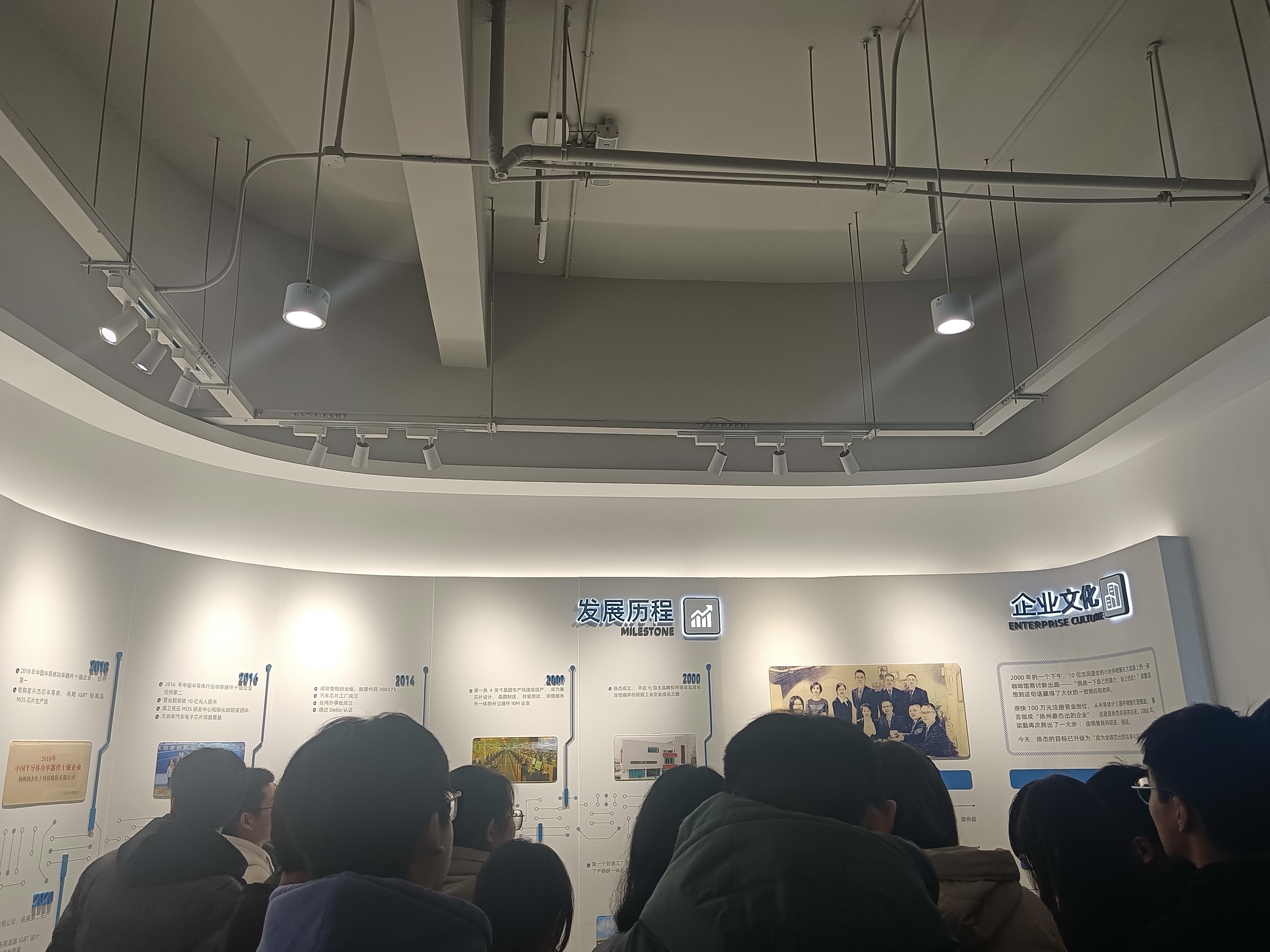 下午2点30分搭载教师、学生的校车从扬子津文津楼前准时出发,30分钟的车程难掩学生喜悦之情。到达电子厂后,讲解员首先播放了杨杰电子厂概况视频,从而加深了师生对该厂初步了解。接下来,讲解员向师生详细讲解了企业文化。讲解完毕后,讲解员带领师生实地参观了三极管生产车间。透着玻璃,只见机器运转不停,车间技术人员来回穿梭于各机器之间,好不忙碌。走出车间后,讲解员与同学们进行了互动交流。互动中同学们发言踊跃,提出了许多有趣且有价值的问题,讲解员一一进行了回答,场面热烈,笑声不断。毛中特、新思想教研室教师、电子2203、2204班31位同学参加了此次实践教学活动。