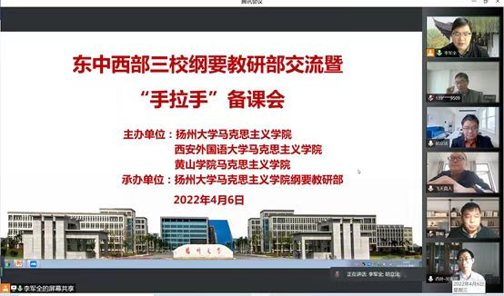 为切实提升思政课教学质量与效果,4月6日,教研部联合西安外国语大学马克思主义学院纲要教研室、黄山学院马克思主义学院纲要教研室共同举行了一场线上“东中西部三校纲要教研部交流暨‘手拉手’备课会”。这是教研部首次承办东中西部多校教研联动的重要会议,也是集体备课制度的一项重要创新成果。