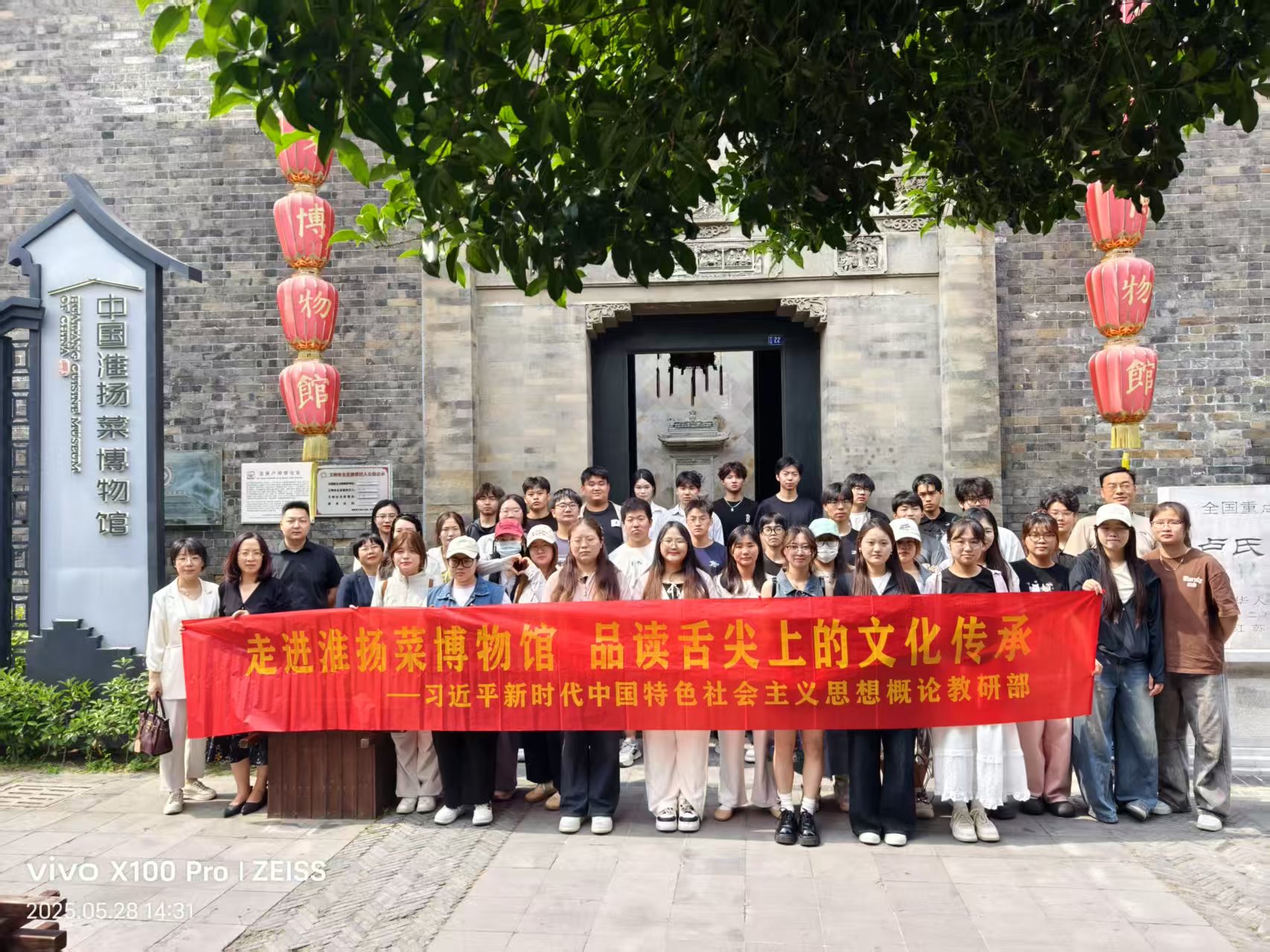 2025年5月28日下午,“习近平新时代中国特色社会主义思想概论”教研部与“毛泽东思想和中国特色社会主义理论体系概论”教研部赴中国淮扬菜博物馆开展了“品读舌尖上的文化传承”实践教学活动。参加此次实践教学活动的同学来自扬州大学旅游烹饪学院烹饪2303,2304和2305班。