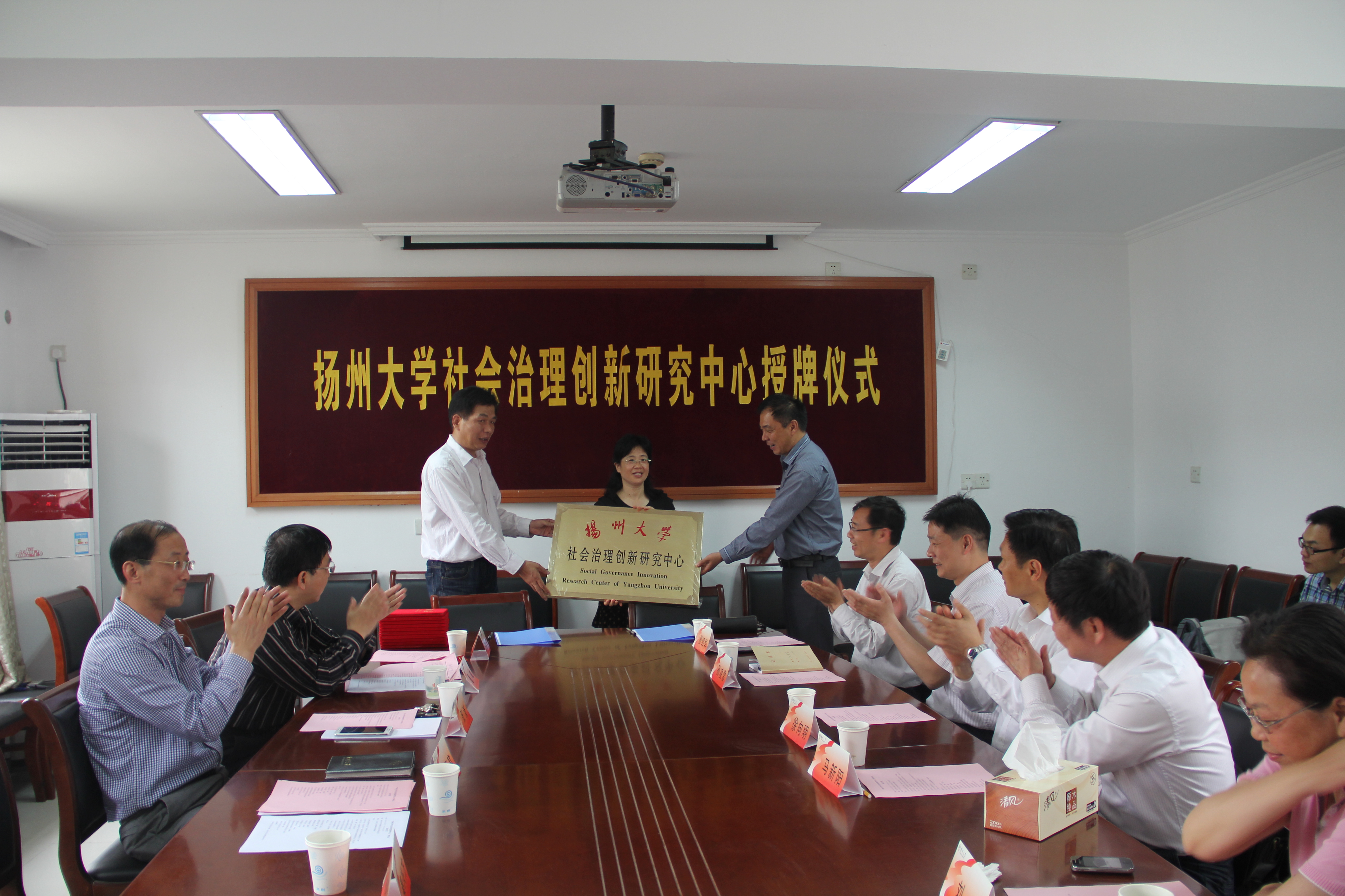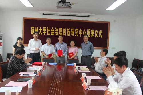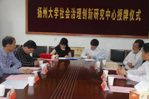 仪式上,曹峻副院长宣读了关于成立“扬州大学社会治理创新研究中心”的文件;校人文社科处秦兴方处长、马克思主义学院佘远富院长共同为“研究中心”授牌并为研究员代表颁发聘任证书。中心负责人王晓燕教授简明介绍了研究中心的基本情况、运行机制、工作打算及研究目标。广陵区环保局局长马新阳与研究中心签订了校地合作研究项目书。
