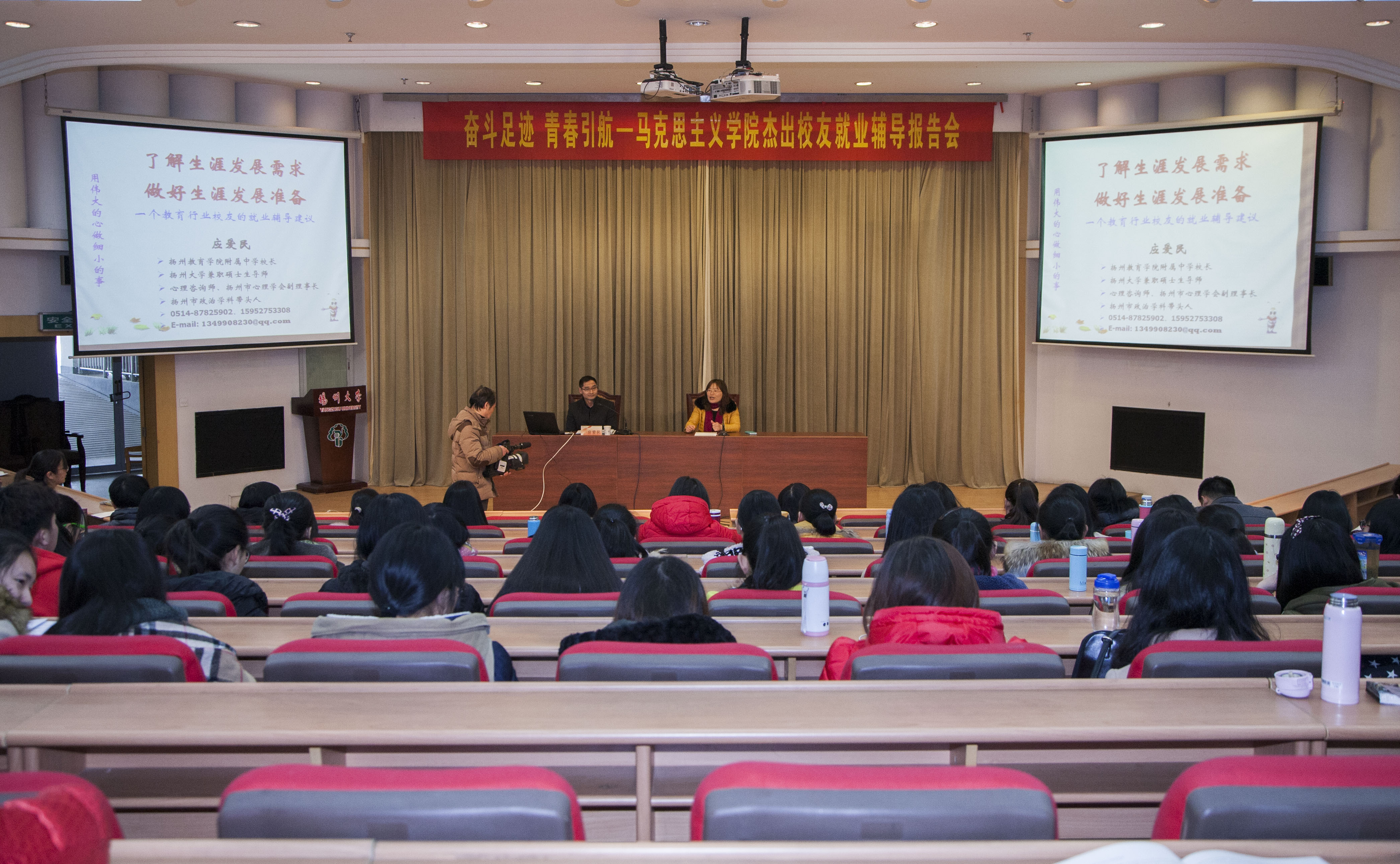 3月11日下午,我院政教1993届校友、扬州市政治学科带头人、扬州教育学院附属中学校长、学院兼职硕士生导师应爱民老师应邀,在逸夫图书馆报厅为我院全体学生作了《了解生涯发展需求 做好生涯发展准备——一个教育行业校友的就业辅导建议》的辅导报告,与师生代表分享他对于生涯发展的理解与感悟。院党委副书记、副院长左红梅主持报告会。