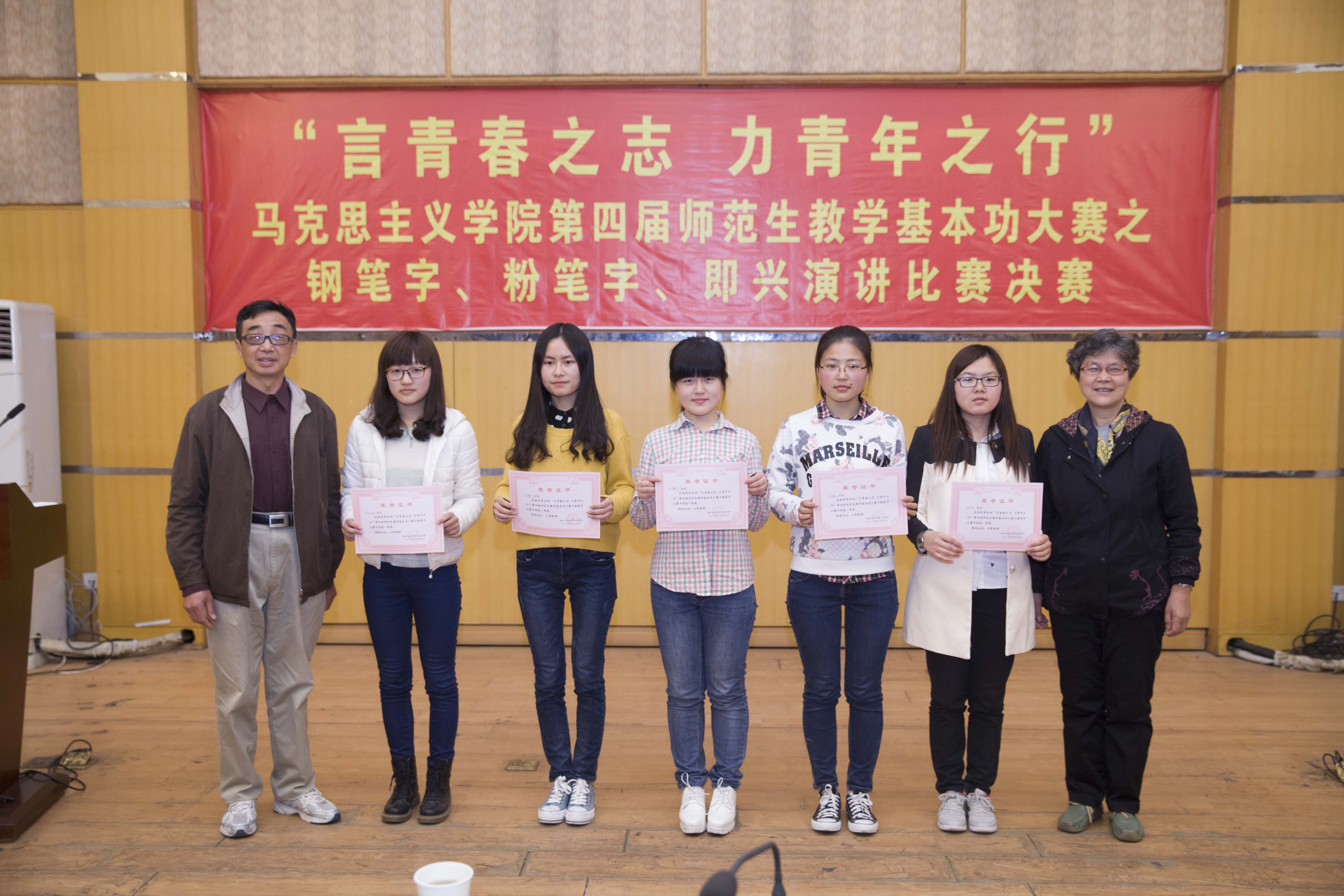 “言青春之志,力青年之行”。2015年4月15日,扬州大学马克思主义学院第四届师范生教学基本功大赛在荷花池校区E226拉开序幕。本次大赛包含“两字一讲”竞赛、课件制作比赛和说课大赛三大环节。当日举行的是“两字一讲”竞赛,即钢笔字、粉笔字、即兴演讲比赛决赛。学院关工委副主任杨燕、政教教研部胡钰等老师担任本环节比赛评委。大赛评选出27件优秀钢笔字作品,朱静、徐廉欣等5名同学荣获一等奖;评选出27件优秀粉笔字作品,陶丽、胡昕珏等5名同学荣获一等奖;15名同学参加即兴演讲决赛,张静静、崔雯青获得一等奖。赛后,杨燕老师对比赛进行了精彩点评并提出了宝贵建议。本次大赛旨在促进师范生教学基本技能提升,为广大学生提供学习交流展示的平台。
