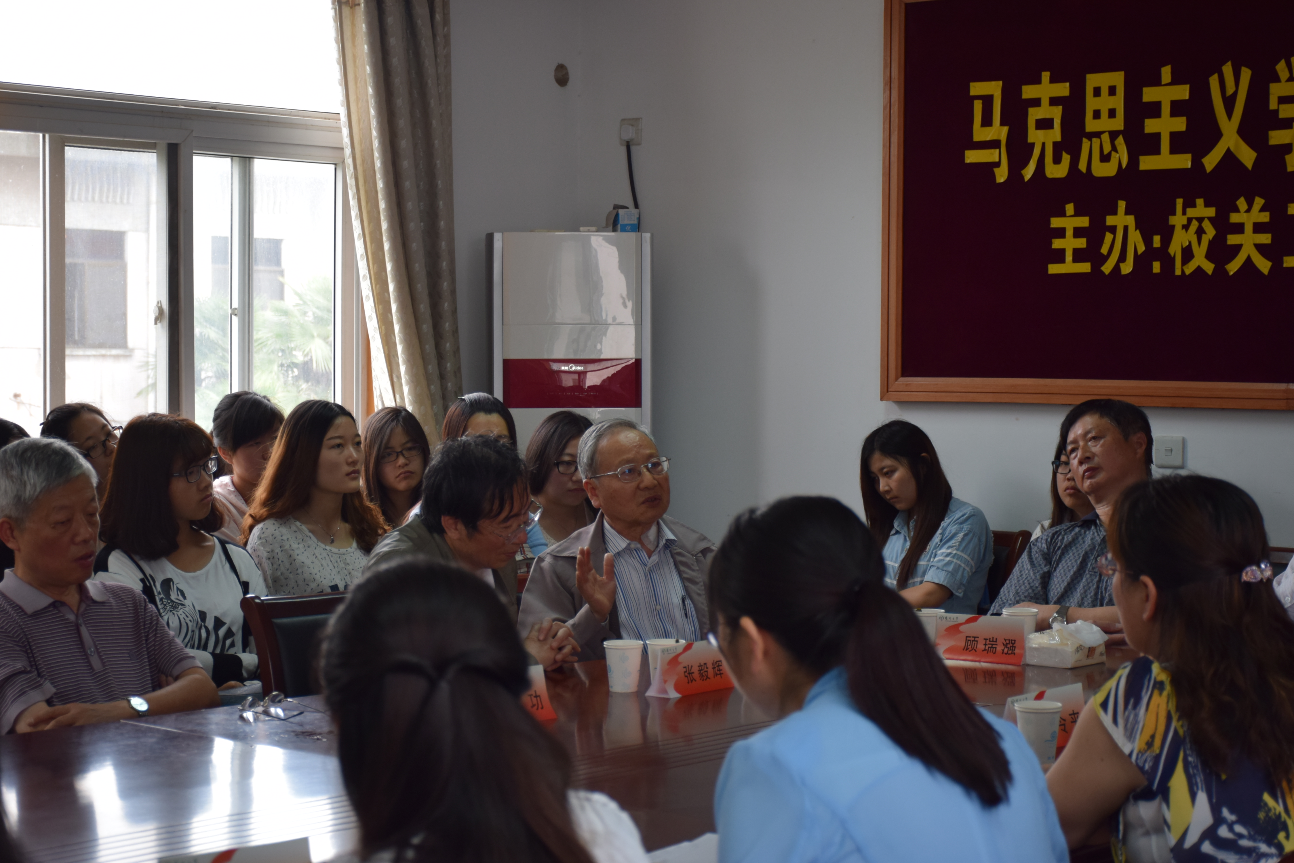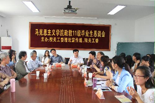 5月28日,校关工委理论宣讲组、我院关工委共同举办的政教1101班毕业生恳谈会在会议室举行。校关工委理论宣讲组顾瑞漒、杨千朴、张毅辉、孔令来、程自功、杨燕6位老师以及学院党委书记、关工委名誉主任吴荣军,党委副书记、关工委主任左红梅出席恳谈会,并与毕业生同学展开了热烈的交流。座谈会上,在了解毕业班同学的就业意向和就业情况后,顾瑞漒、杨千朴等老师对毕业生提出了殷切的期盼,期望毕业生同学能够树立崇高理想信念,运用所学知识,造福社会,回报父母,同时对在座同学提出的问题和困惑,以自身的学习工作与生活经历进行了一一解答。恳谈会为马克思主义学院政教11级毕业生上了“生动一课”,生动展现了关工委老教师对毕业生的深深关爱之情和殷切期同时为毕业生今后的学习工作指明了方向。