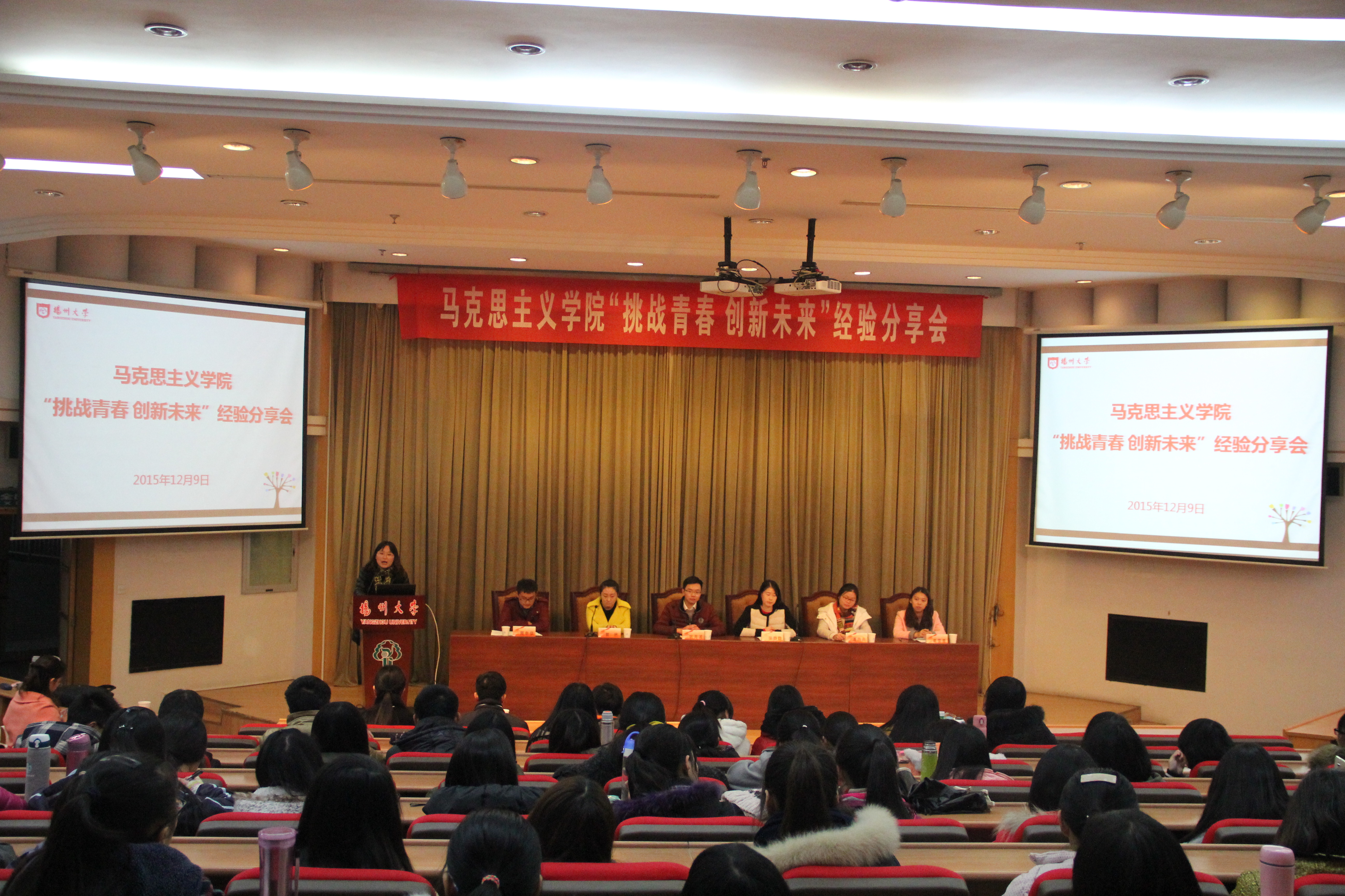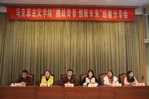 12月19日下午,马克思主义学院在荷花池校区逸夫报告厅举行“挑战青春 创新未来”经验分享会。第十四届大学生“挑战杯”竞赛特等奖获得者——“绿行调研团”全体成员参加会议并一一分享竞赛经验及体会。马克思主义学院党委副书记左红梅,政教1201班班主任林祖华教授,团委、学工办全体教师出席活动。分享会由团委副书记杨方主持。