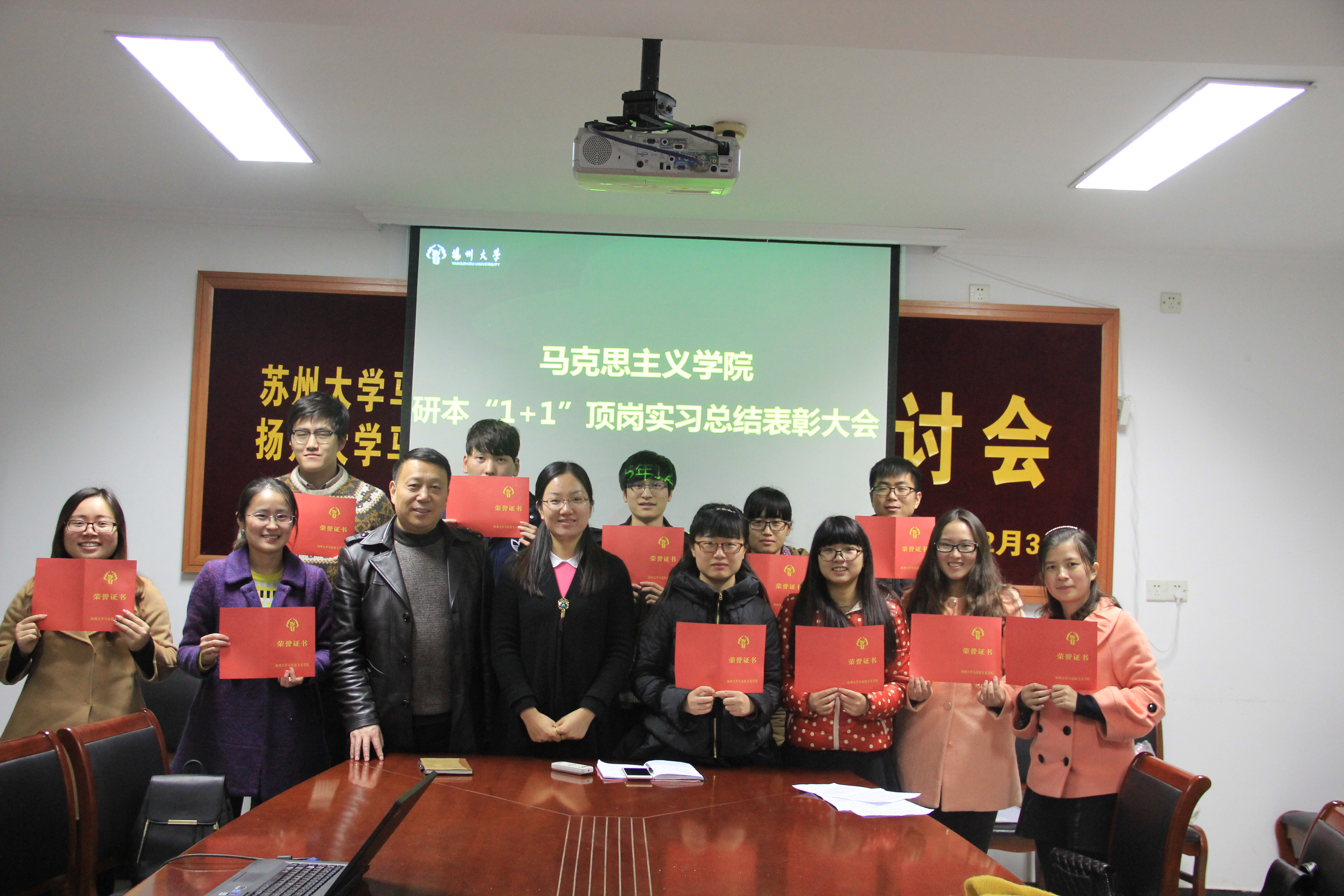 12月9日下午,马克思主义学院2015年研本“1+1”顶岗实习总结暨表彰大会在学院S209会议室举行。部分指导教师和全体顶岗实习学生参加会议。
