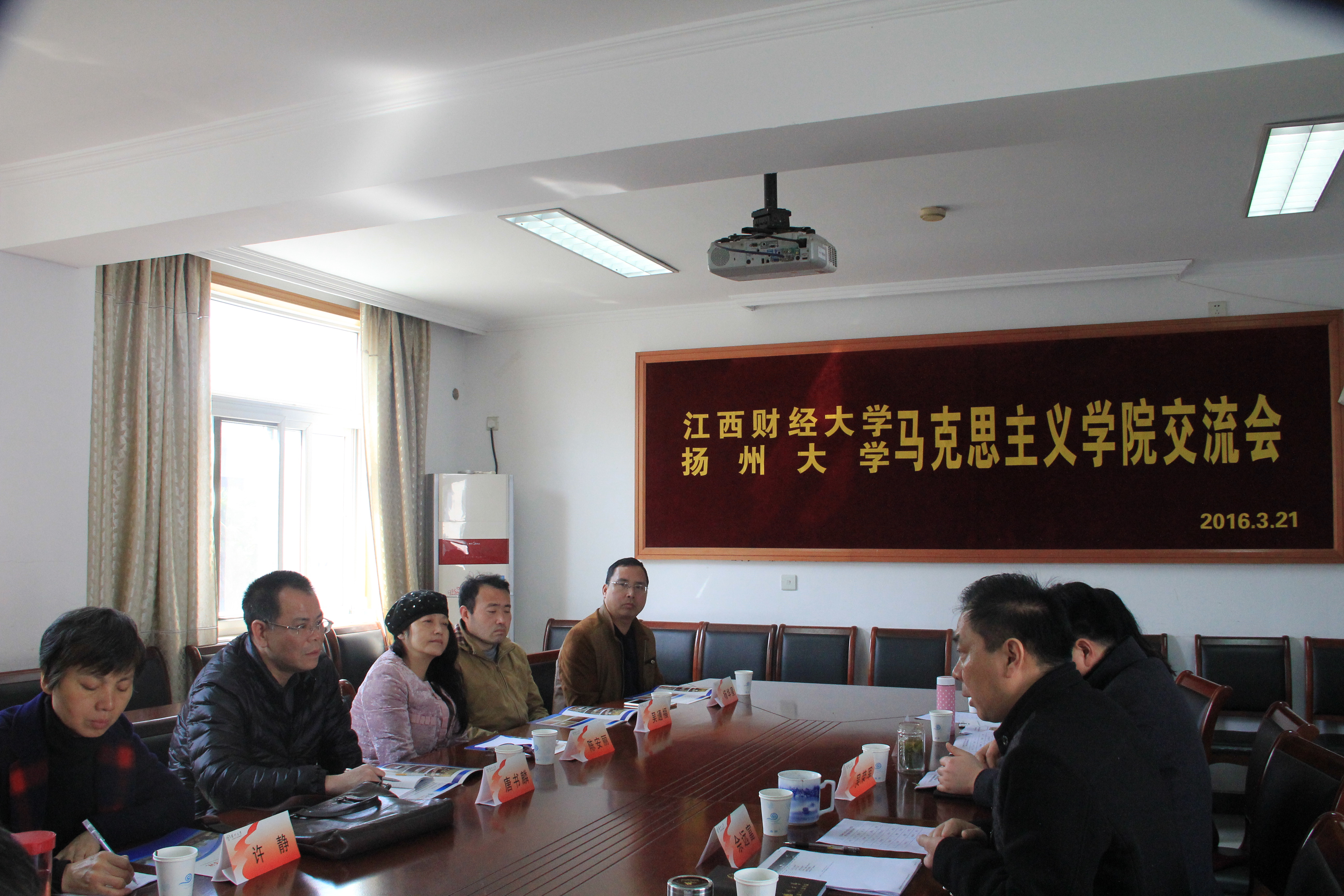 2016年3月21日上午,江西财经大学马克思主义学院副院长唐书麟一行莅临我院交流工作。双方主要围绕学科建设、师资工作、思想政治理论课教育教学等工作进行了研讨。全体院领导出席交流会议。