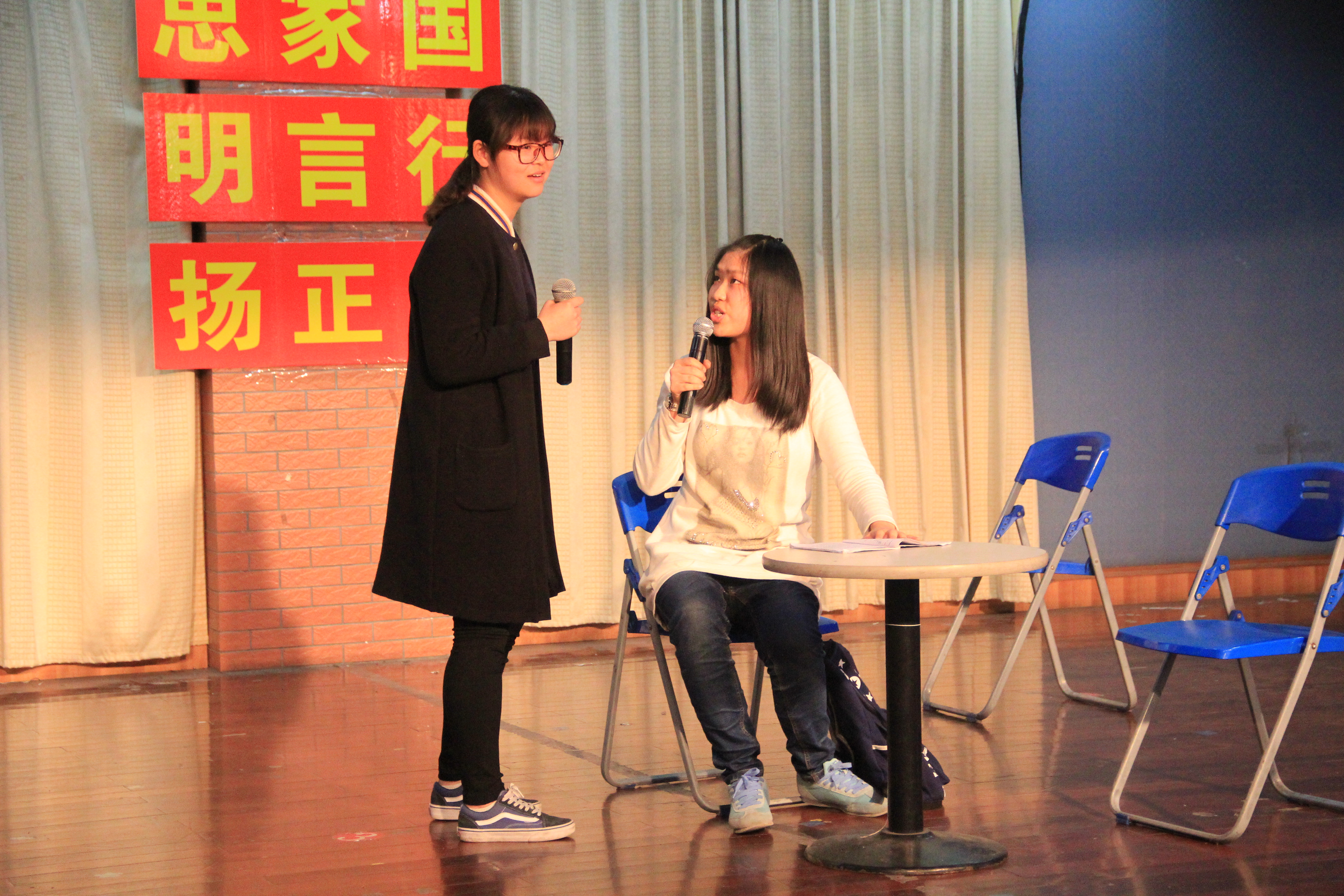 经过初赛的层层筛选,来自7个班级的8个节目进入决赛。大赛现场,语言幽默,情节跌宕。政教1401班表演的《暴走大事件》通过曾经引发大讨论的时事热点,透析了不传谣、不信谣的重要性;孙经纬等同学联袂出演的《诚信坎坷路》从考试作弊演起,诉说了诚信为人的可贵品质;本科生毕业班徐廉欣等同学通过《大学第一课》倾情演绎了初入大学时的羞涩和懵懂,引发了现场浓郁的怀旧思绪;政教1301班带来的《手机风波》生动直击大学生“低头族”现象,引起现场观众的集体大反思;来自研究生1501班的《生命中不可或缺的你》完整再现了杰出校友从初中到大学拼搏奋斗的人生经历。