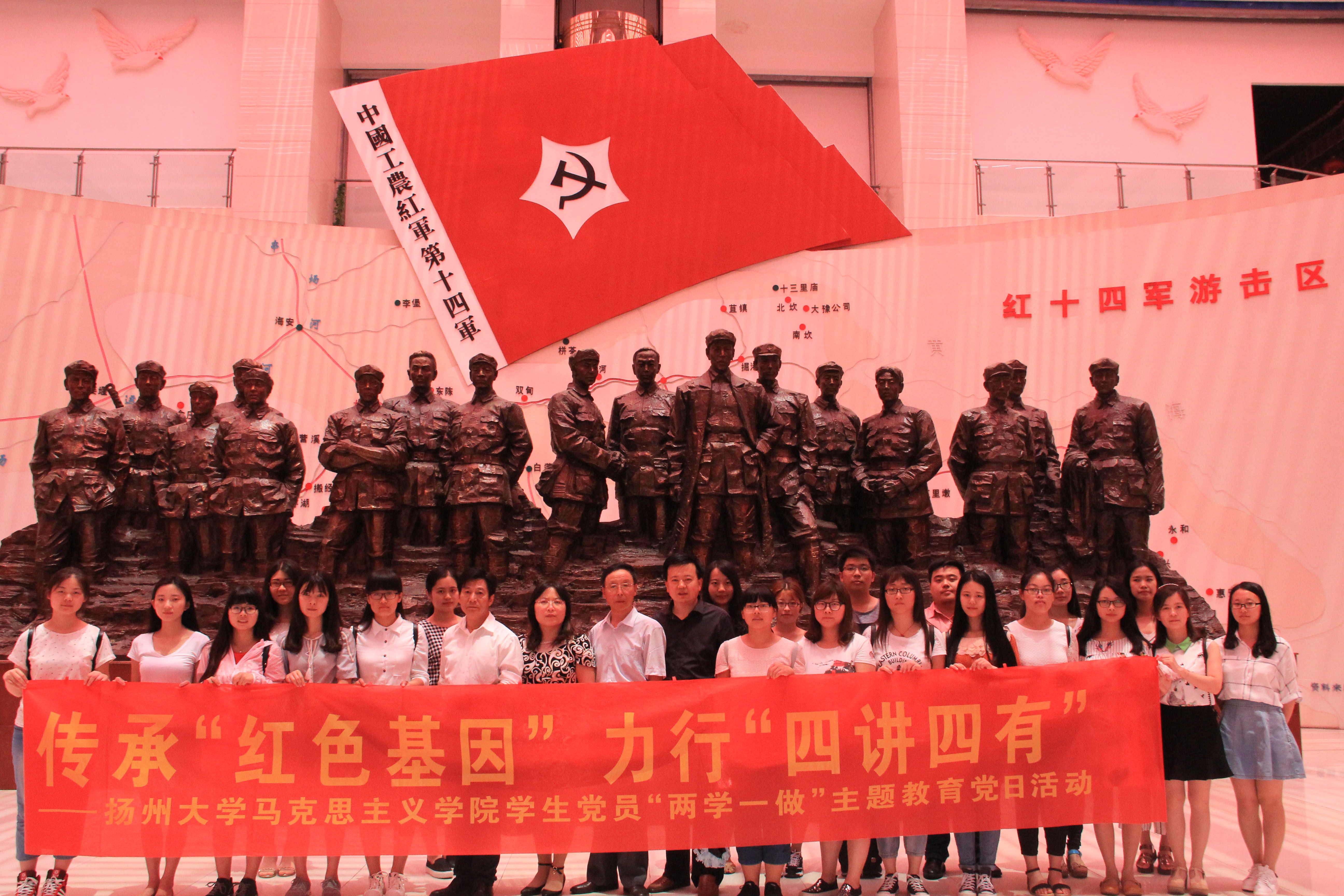 “松柏丛中红枫火,俱是烈士血染成”,仲夏时节的如皋红十四军纪念馆端庄肃穆,缅怀参观者络绎不绝。在纪念馆内的道德讲堂里,印有“传承‘红色基因’ 力行‘四讲四有’标题的巨大横幅映入眼帘,一群年轻的学生或坐或站,或凝神沉思或洪亮发言,我院学生党支部主题党日活动正在火热进行。“我为什么要入党”,党日活动的主要策划者、本科生党支部书记杨方老师一开始就将活动的目标定位于此。“我为什么要入党,这是一个看似轻松简单,实则事关重大的问题。”杨方老师说。