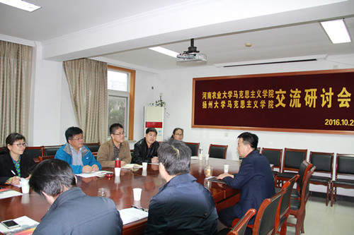 2016年10月28日上午,河南农业大学马克思主义学院党总支书记徐峰等一行莅临我院交流工作。双方主要围绕党的建设、学科建设、师资工作、思想政治理论课教育教学等工作进行了研讨。我院党委书记吴荣军,副院长曹峻、胡立法出席交流会议。