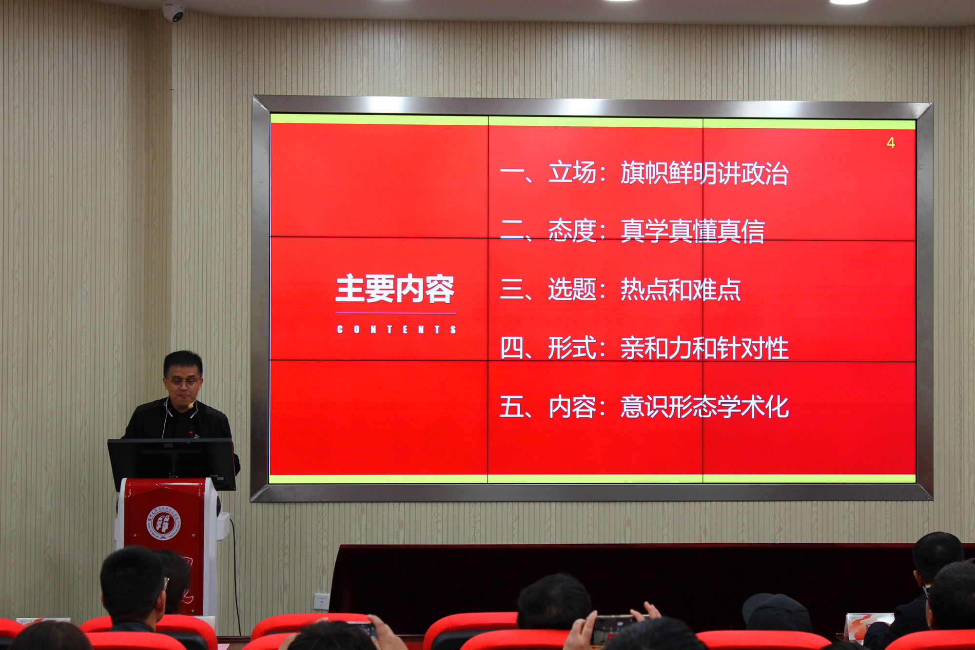 唐忠宝教授以“提升思政课堂教学魅力的几点思考”为主题,作了精彩的教学分享报告。他认为,一堂精彩的思政课由立场、态度、选题、形式、内容等五个方面塑造。思政课教师在立场上要坚持旗帜鲜明讲政治,在态度上要坚持真学真懂真信,在选题上要紧扣热点和难点,在形式上要不断提升亲和力和针对性,在内容上要注重意识形态学术化。