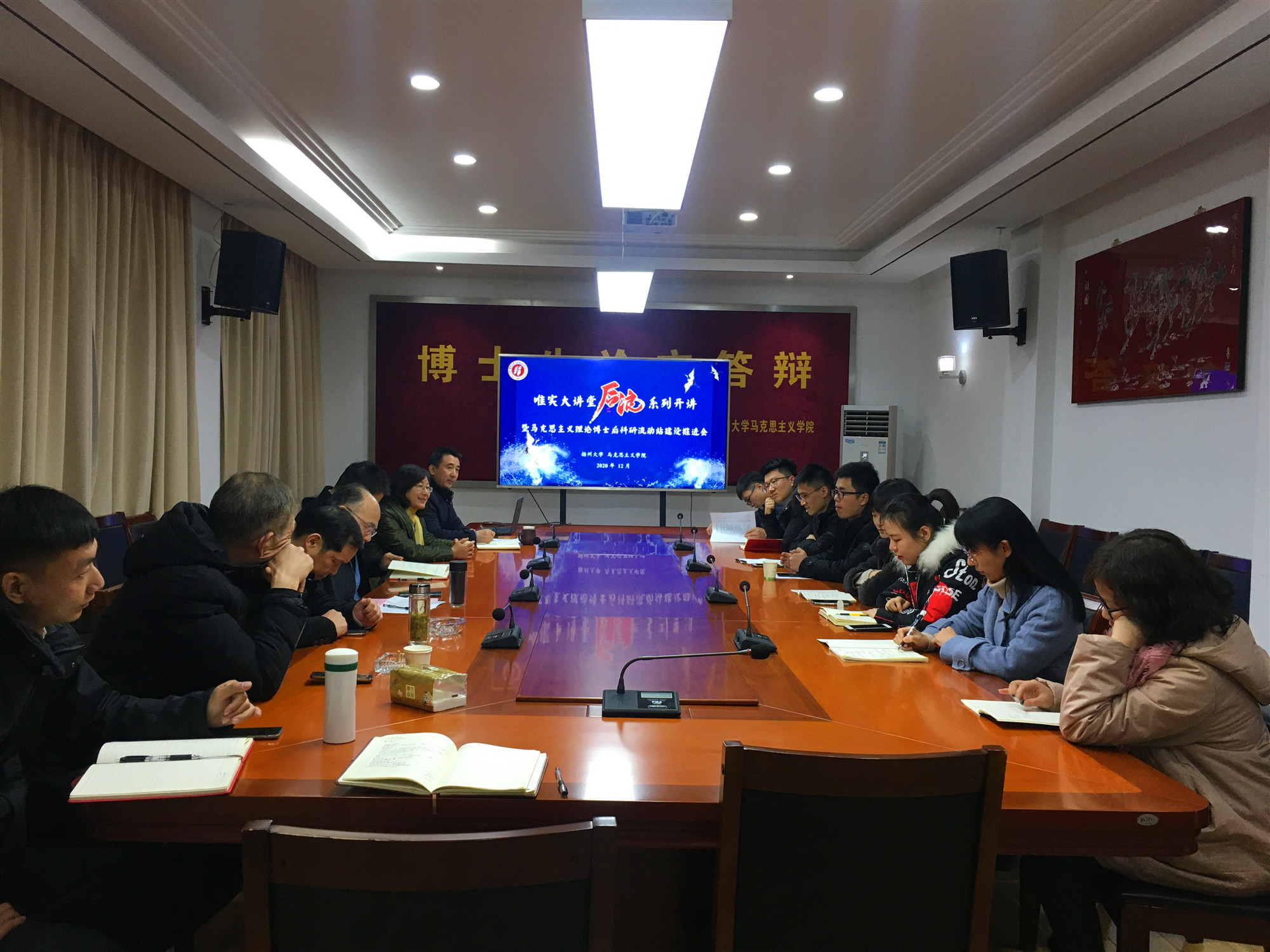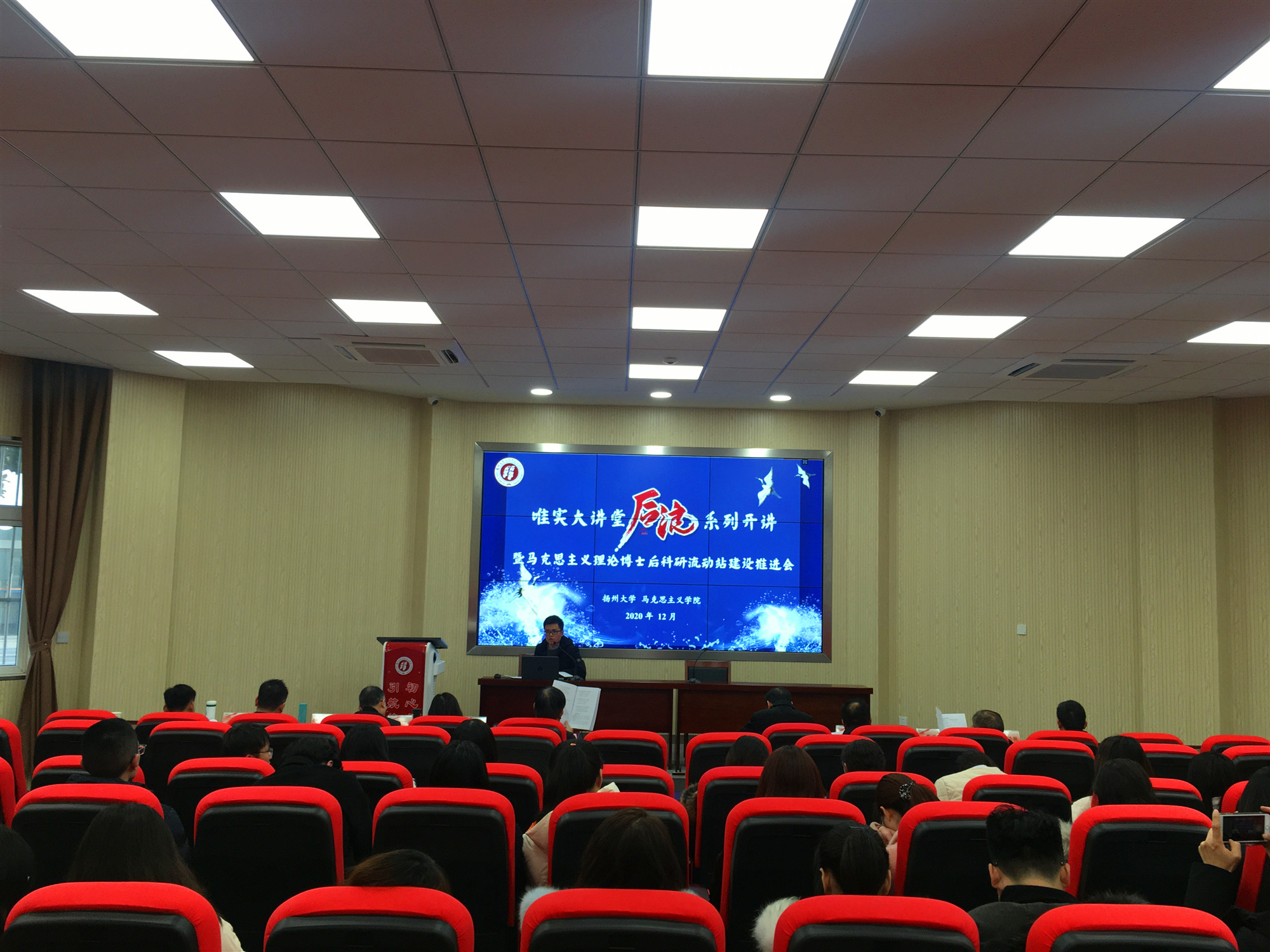 12月20日,马克思主义理论博士后科研流动站建设推进会暨唯实大讲堂“后浪”系列开讲在路南校区25号楼102报告厅举行。江苏师范大学马克思主义学院院长曹典顺教授、校人事处副处长汤学俊、全体博士后合作导师等应邀出席参加活动。副院长曹功林主持活动。