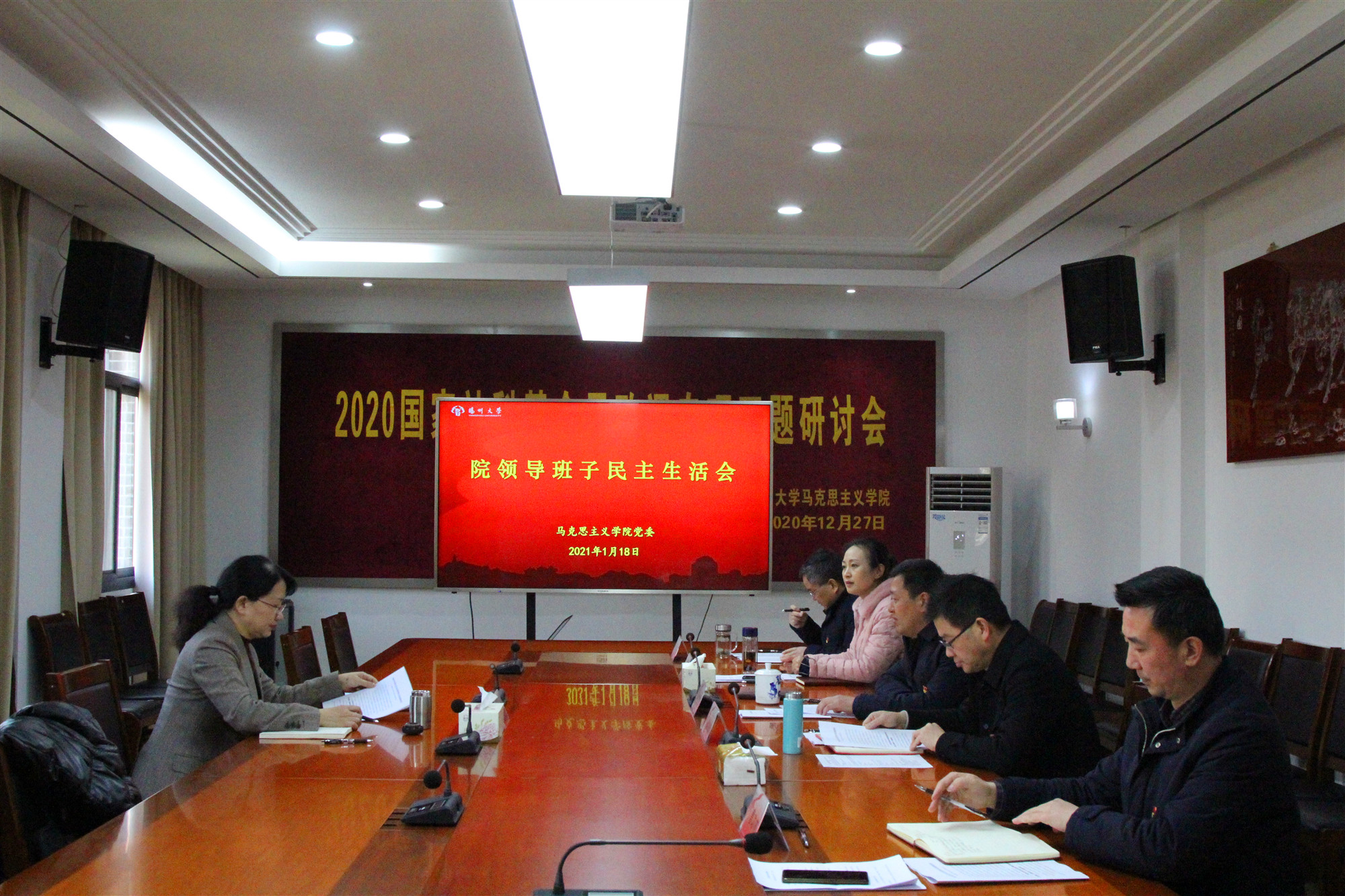 2021年1月19日下午,学院2020年度处级领导干部民主生活会在江阳路南校区19号楼201会议室召开,派驻监察专员、校党委常委、纪委书记周琴同志出席指导会议。院党委书记刘继平同志主持生活会。
