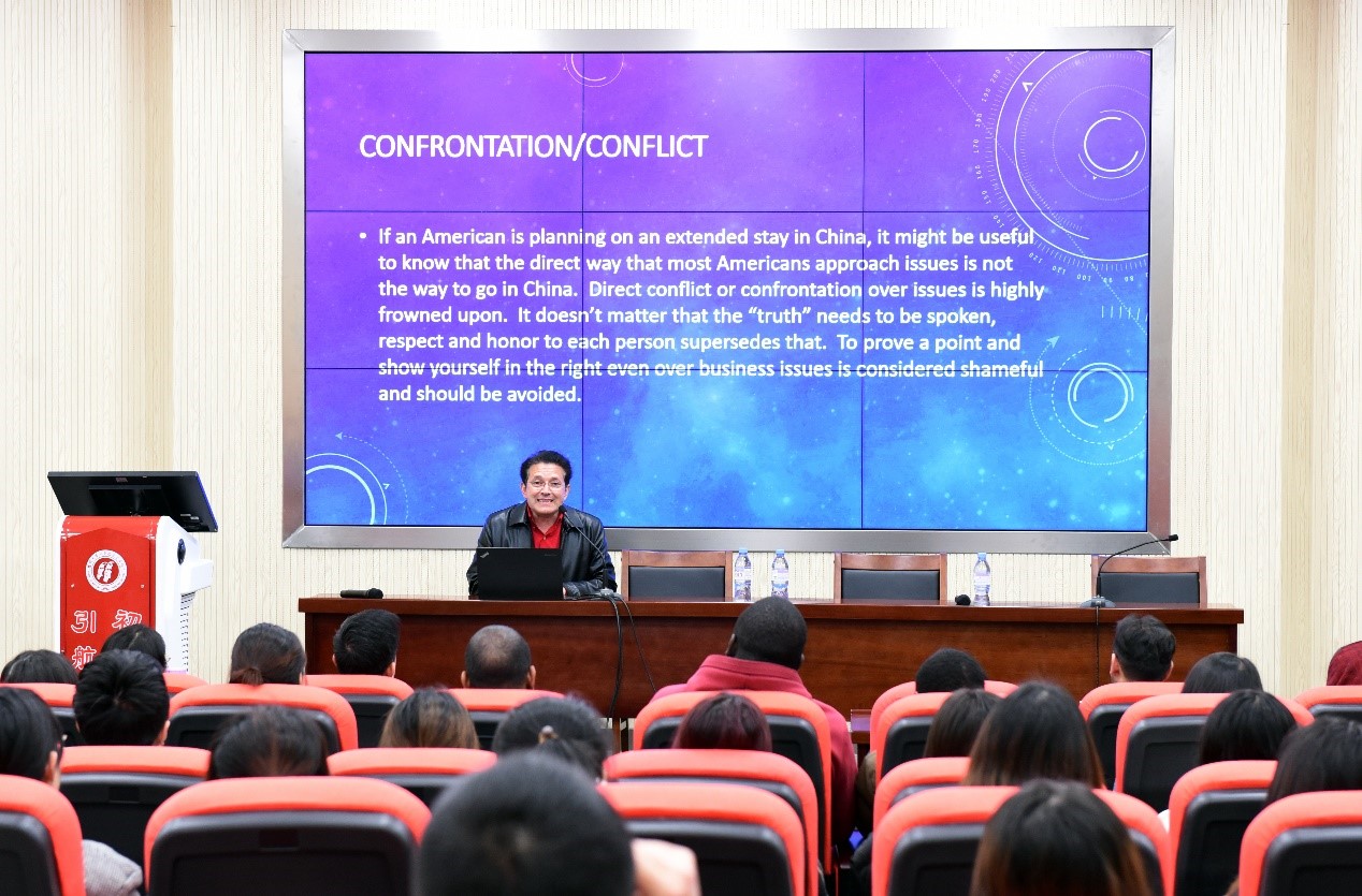埃里克•邓纳姆老师从冲突解决方式、个人与集体观念、个体声誉重视度、社交关系处理、道德价值取向、祭祀传统、谦逊品格、时间敏感度、尊重他人表现形式、认知与行为习惯等十个方面详细阐述了中美两国之间的文化差异,并提出摒弃成见、寻找共同点、加强沟通与对话是有效应对文化差异的基本途径。埃里克•邓纳姆老师还耐心地为现场同学答疑解惑,与大家就中美两国关系未来走向等问题展开了交流与探讨。