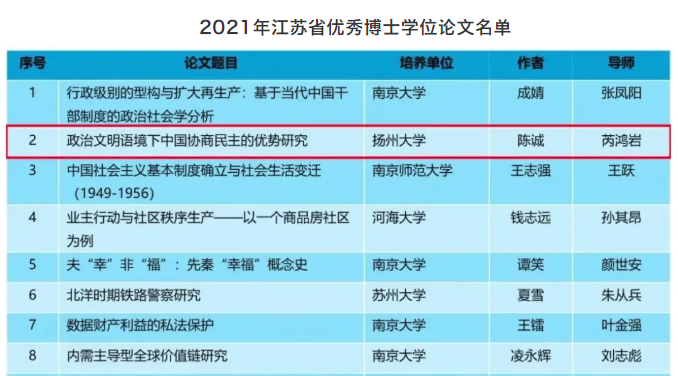 近日,江苏省学位委员会、省教育厅公布了2021年江苏省优秀博士硕士学位论文评选结果,学院1篇博士学位论文获评优秀博士学位论文。