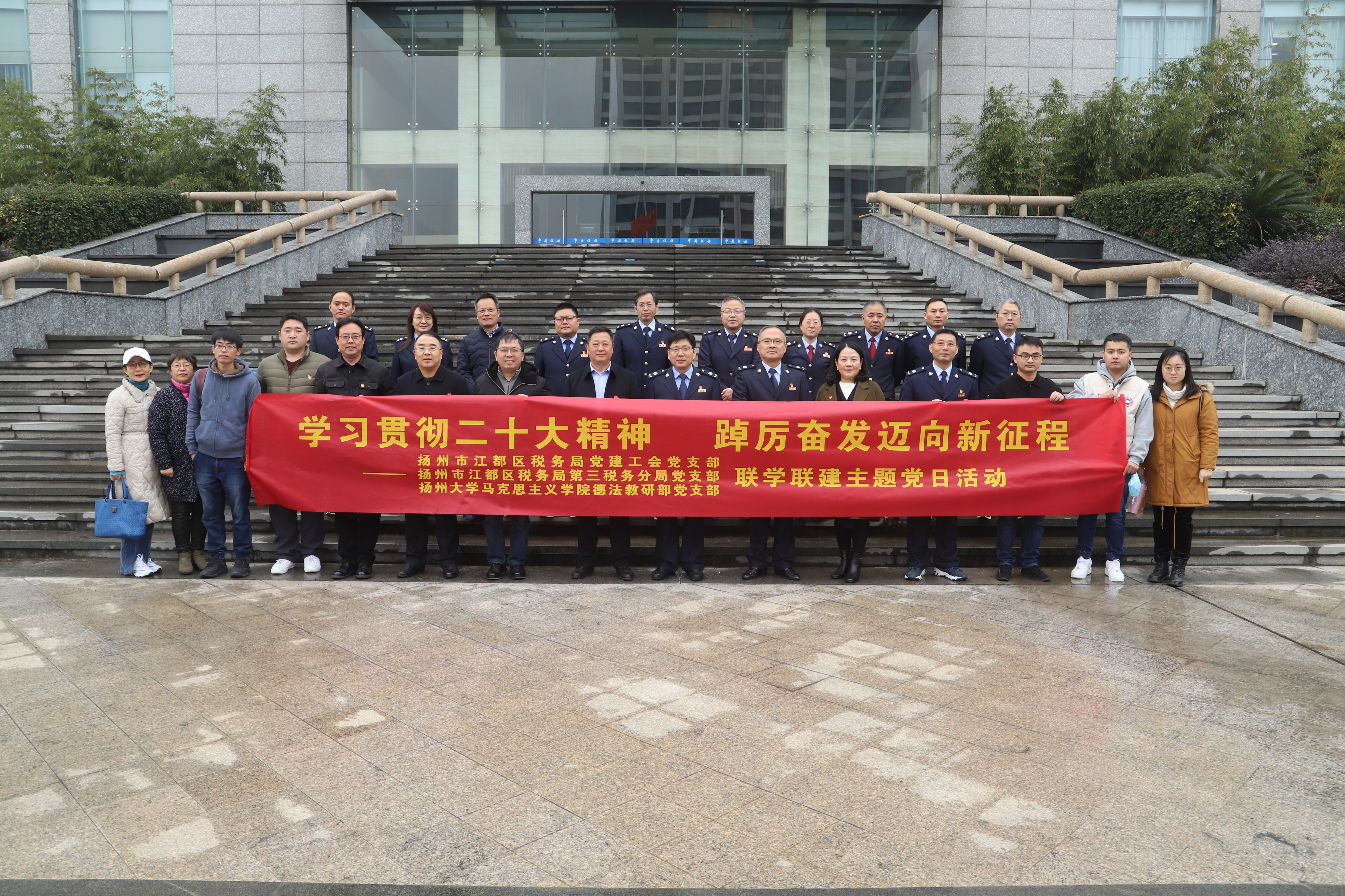 为深入学习贯彻党的二十大精神,在新征程上夺取新的胜利,进一步提升基层党支部建设实效,进一步增强党支部的组织力、凝聚力,12月3日,学院德法教研部党支部和扬州市江都区税务局党建工会党支部、江都区税务局第三税务分局党支部开展“学习贯彻党的二十大精神,踔厉奋发迈向新征程”联学联建主题党日活动。活动在江都区税务局举行。江都区税务局党委书记、局长秦国宝,学院党委书记刘继平、副院长张锋等出席活动。