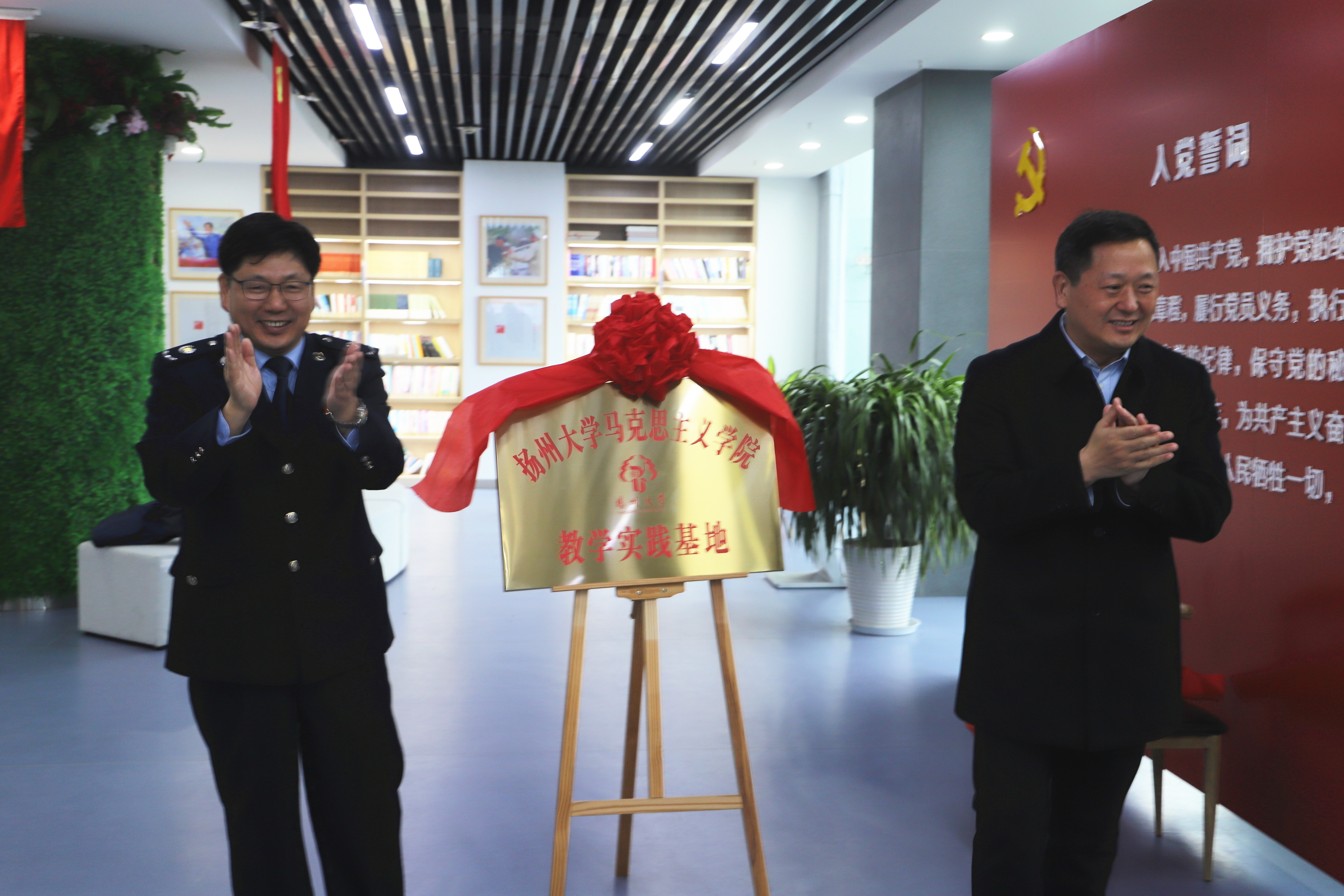 随后,三方进行经验交流与理论学习活动。活动伊始,学院党委书记刘继平,江都区税务局党委书记、局长秦国宝共同为扬州大学马克思主义学院教学实践基地揭牌。