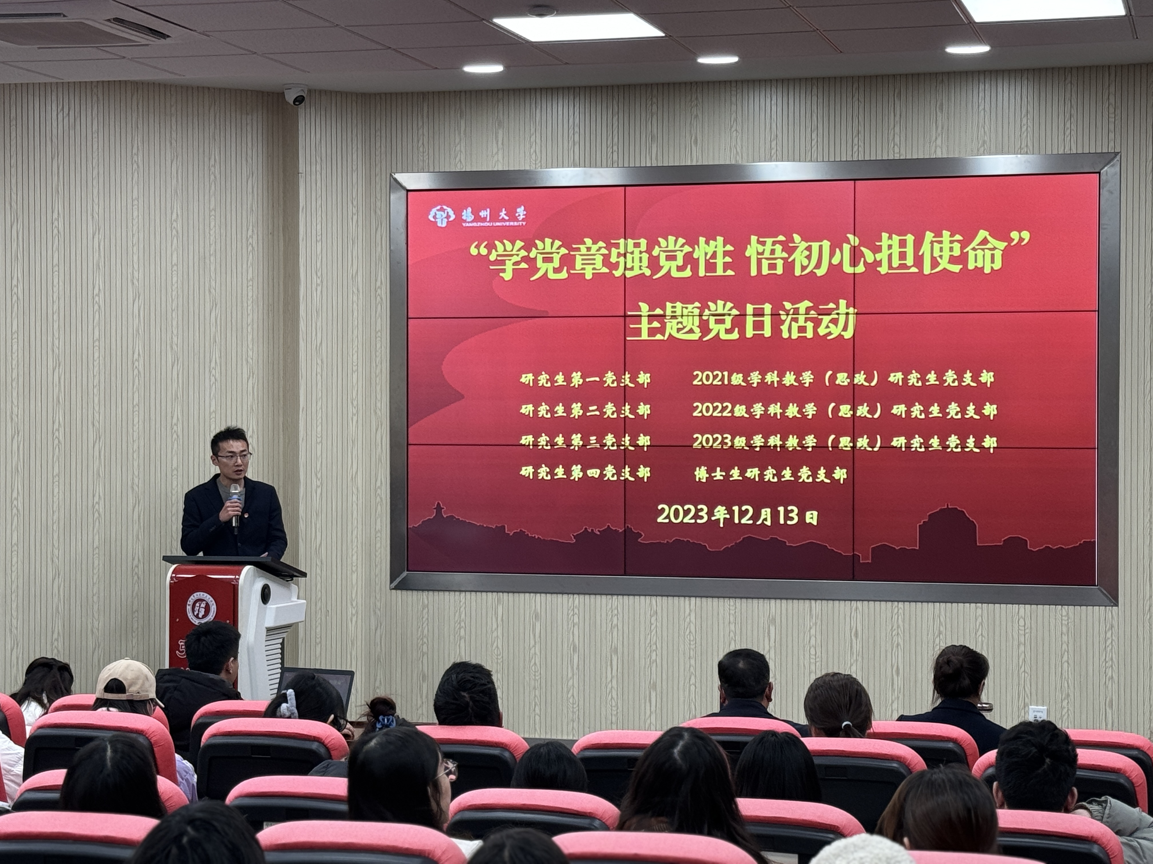 主题党日活动以“学党章强党性 悟初心担使命”为题,分学习榜样、学习党章、学习标识、重温誓词四个篇章进行。党员们集体观看了《焦裕禄生命的最后五十三天》电视片,研究生第二党支部书记王艳红、研究生第四党支部书记陈楚分别领学了《中国共产党章程》《中国共产党党徽党旗条例》,研究生第一党支部书记王萍萍带领全体参会党员重温入党誓词。