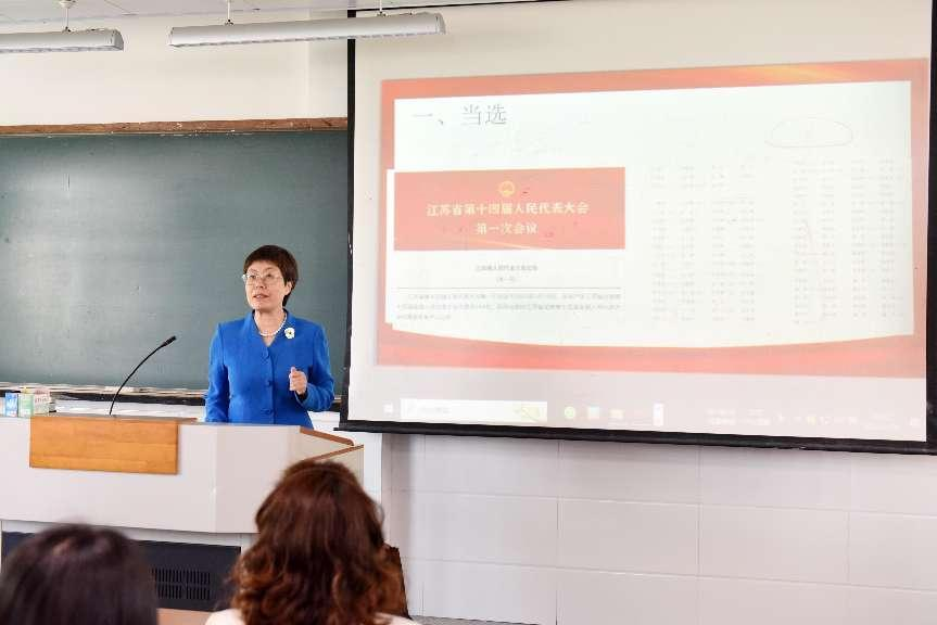 魏华主任紧扣“全过程人民民主”课程教学专题,以自身经历讲述了人大代表的责任和义务,具体介绍了江苏代表团的组成、十四届全国人大二次会议的议程、江苏代表团成员分组讨论的情况,并向同学们传达了会议的主要精神。在她理论联系实际、深入浅出的讲授中,同学们对我国的全过程人民民主有了更真切的感受,也更加深刻地认识到,全过程人民民主义是最真实、最广泛、最管用的民主,要发展社会主义民主政治,就必须坚定不移走中国特色社会主义政治发展道路,不断健全人民当家作主的制度体系,把人民当家作主体现到国家政治生活和社会生活各方面。