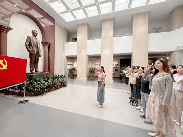参观学习结束后,由学院研究生第二党支部书记王艳红老师带领全体支部师生重温入党誓词,师生党员面对党旗庄严高举右拳,高声领读入党誓词。誓言回荡在馆内,铿锵有力。