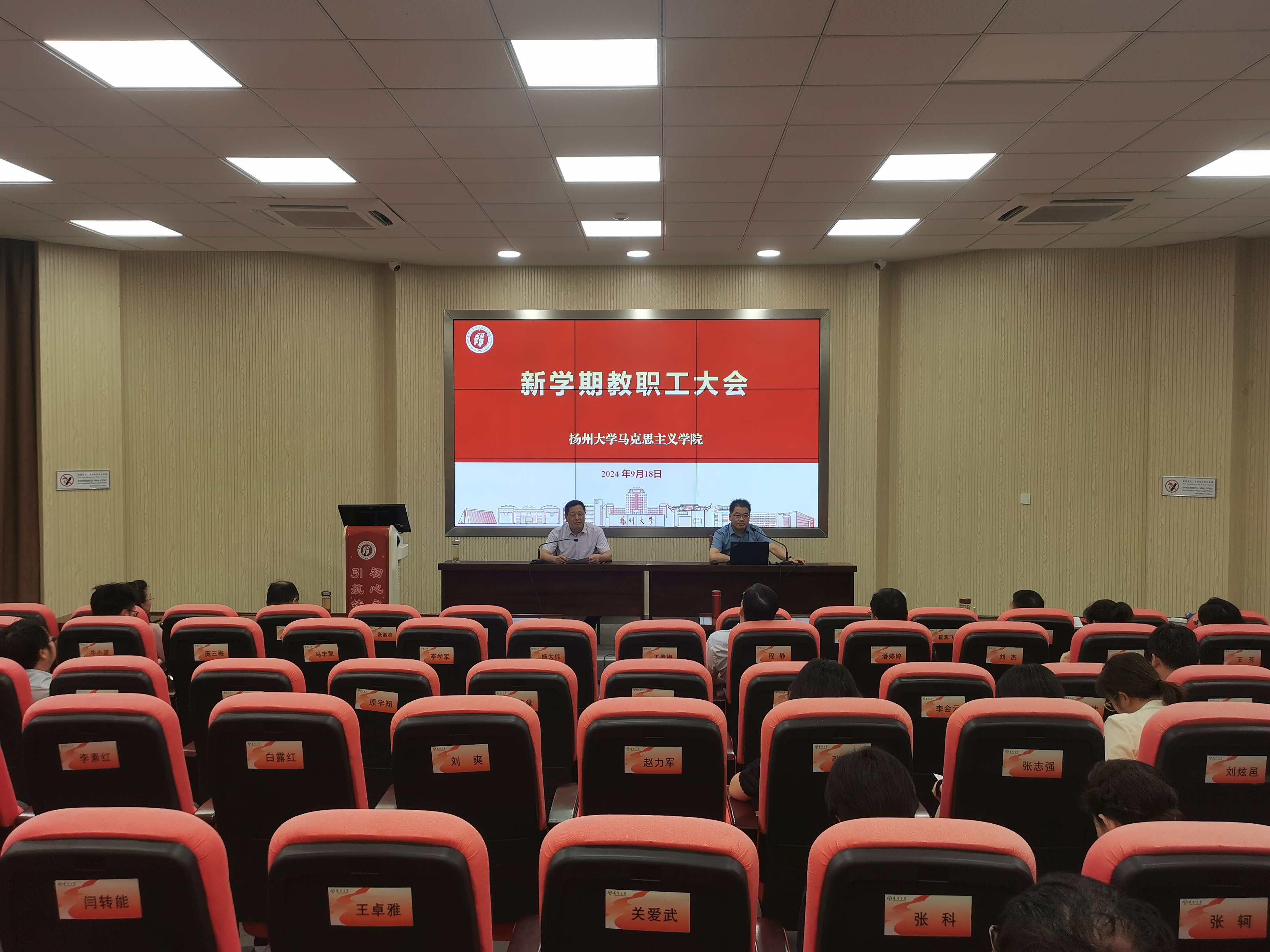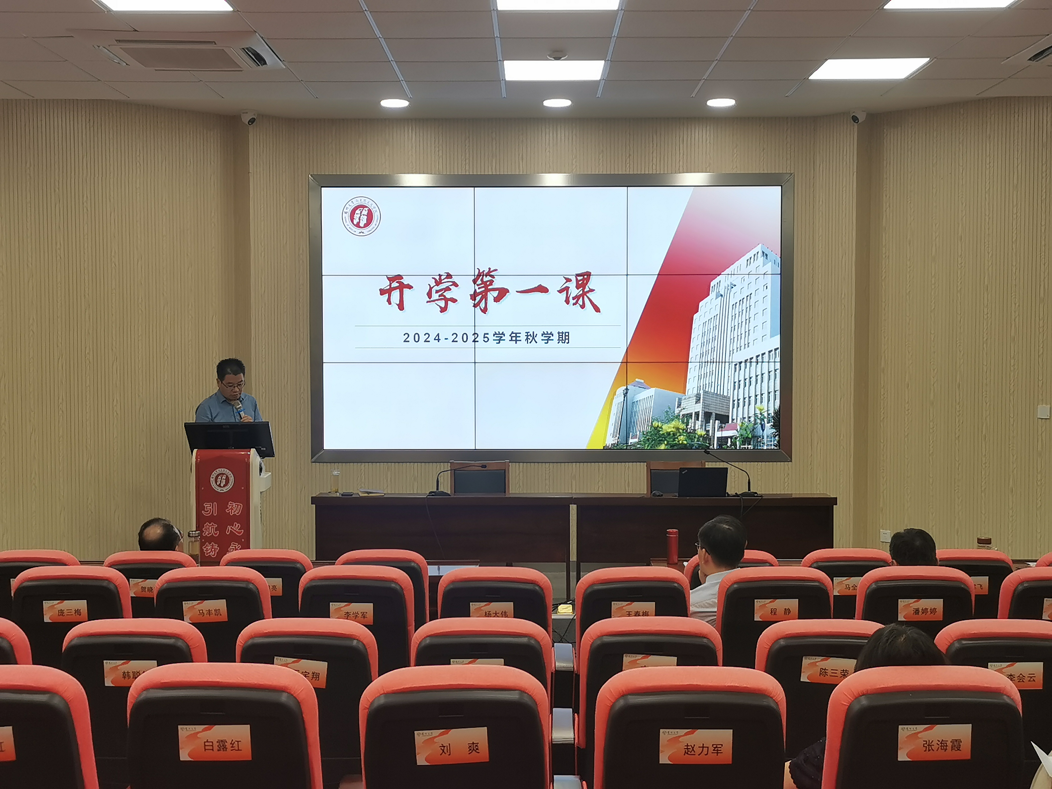 9月18日,学院召开新学期全体教职工大会,刘继平书记主持会议,胡立法院长为学院教职工讲授开学第一课。