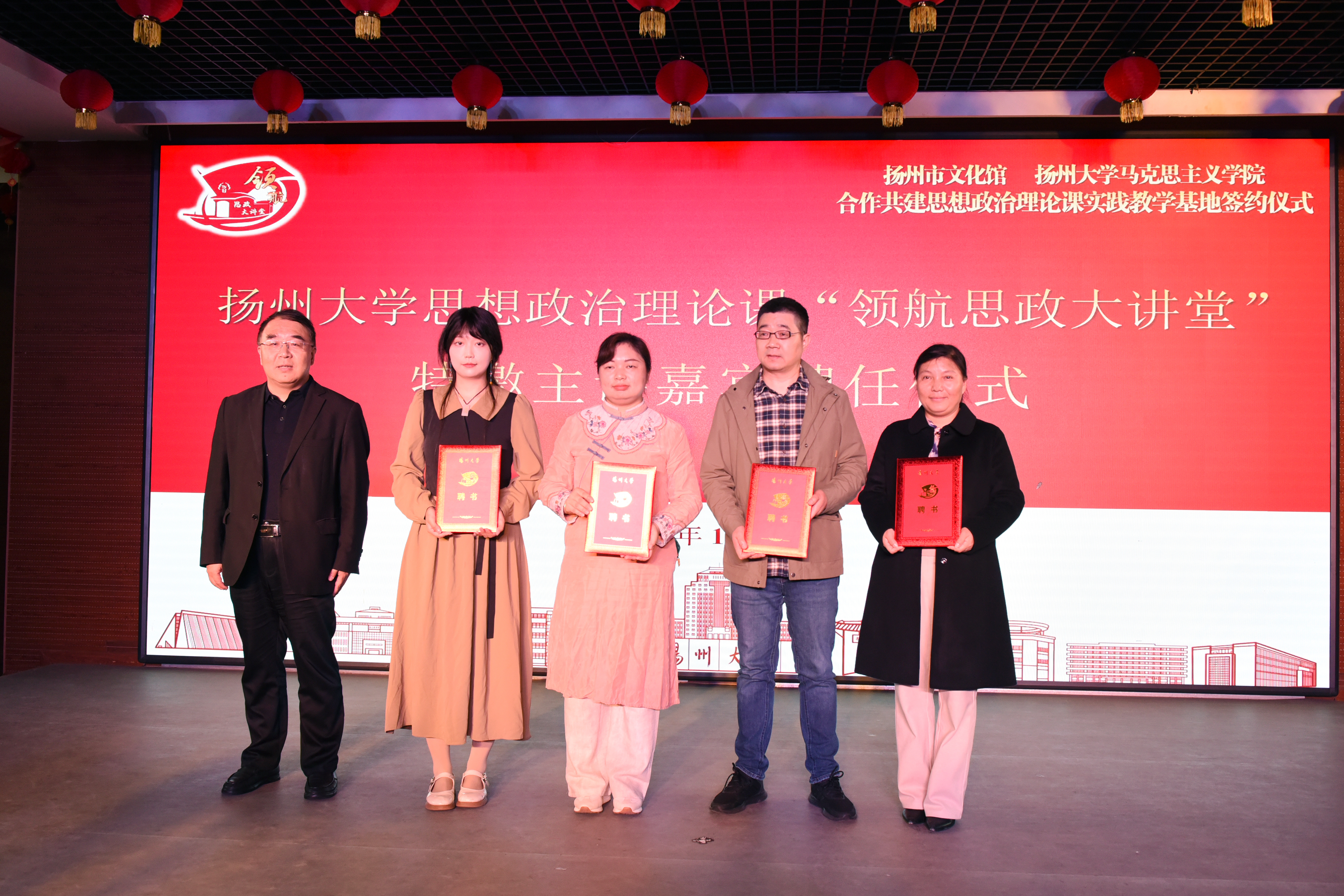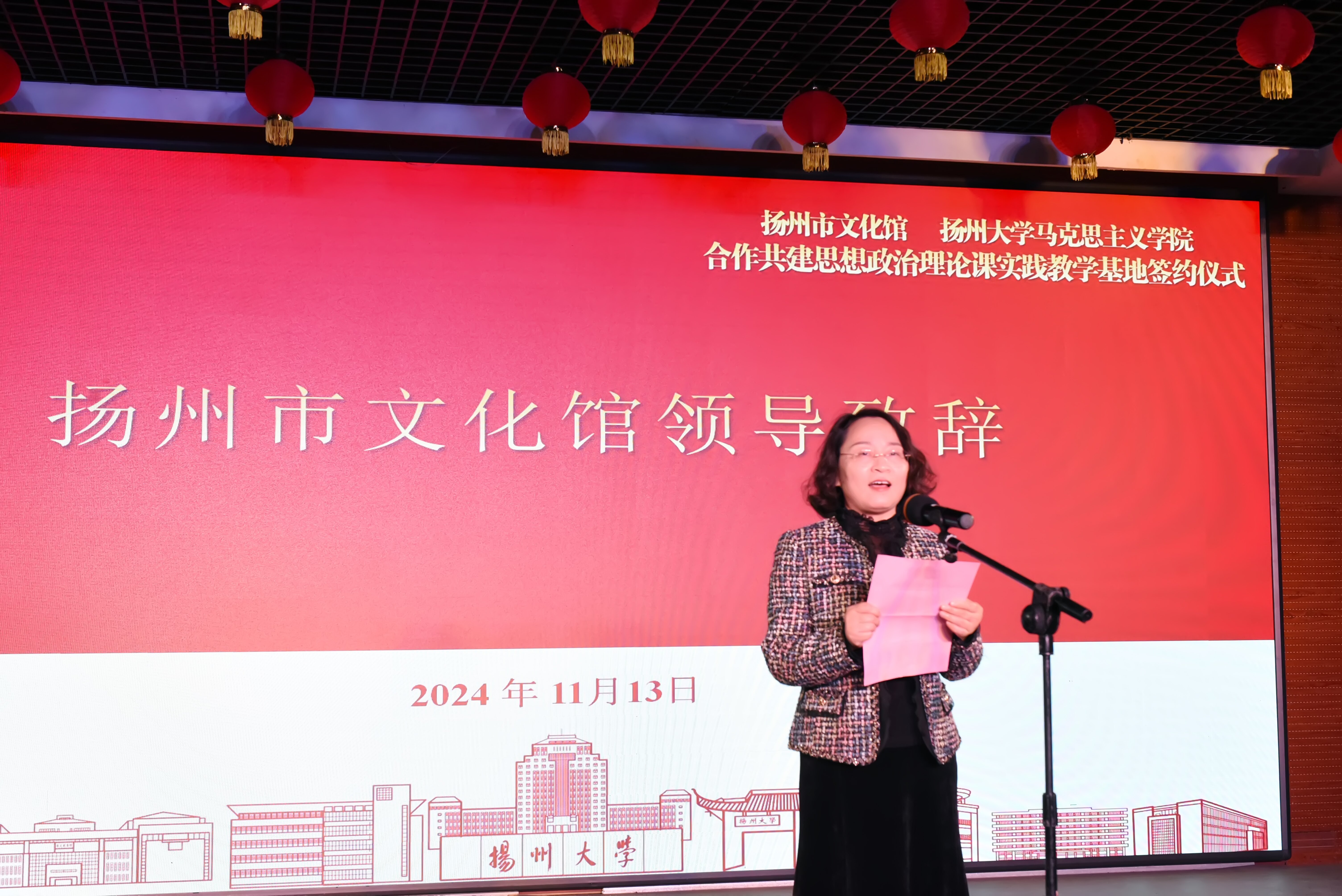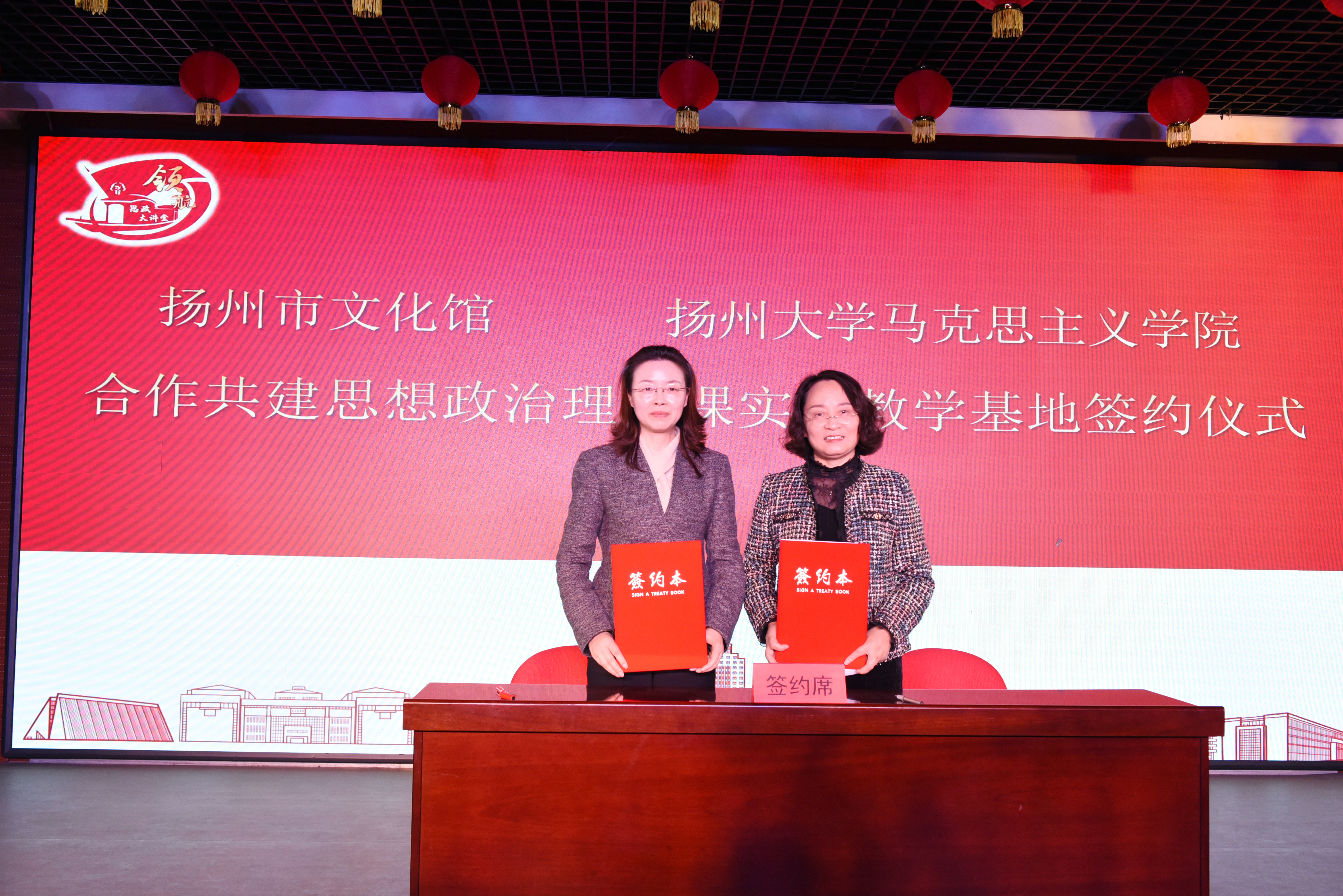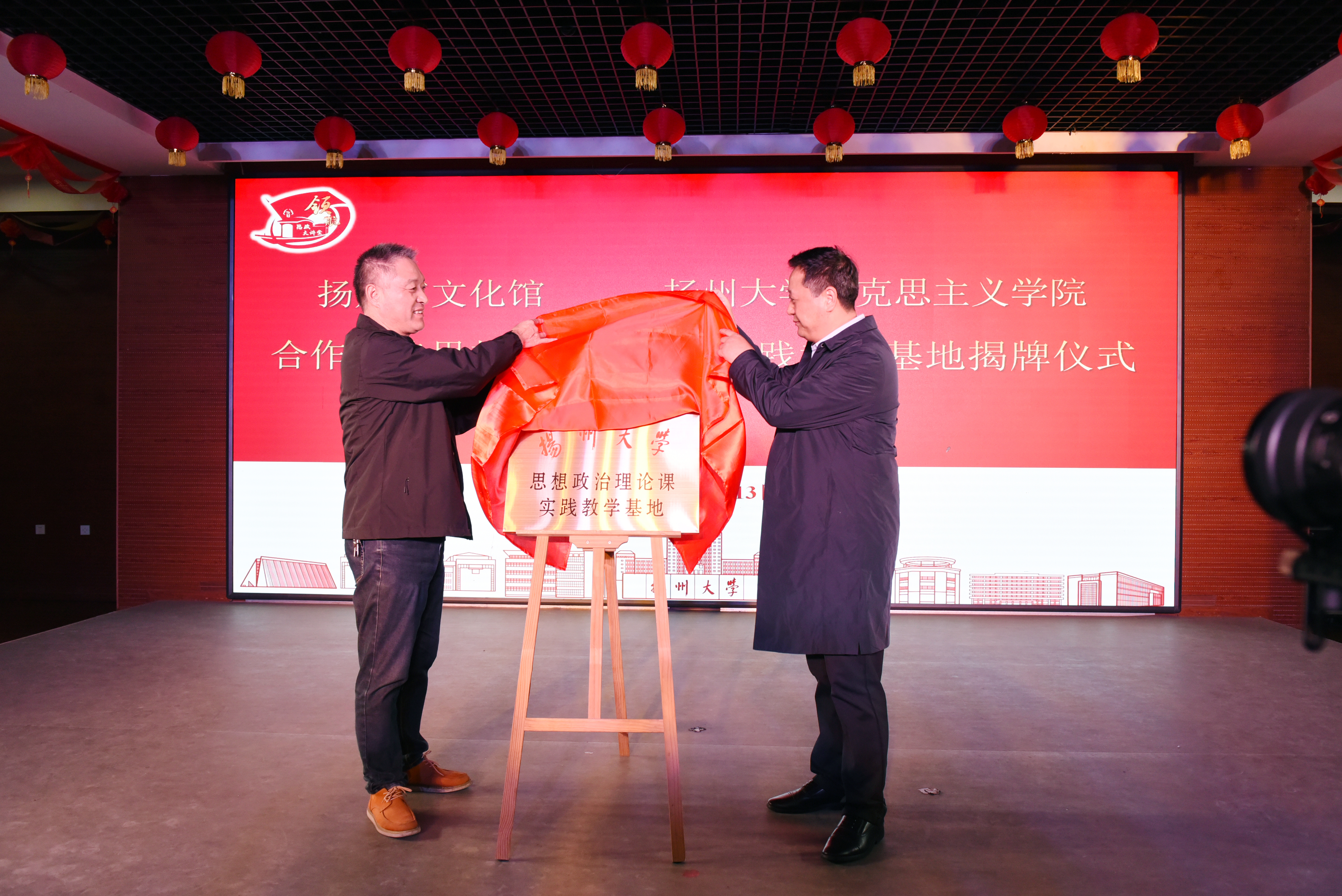 在非遗项目实践教学活动结束后,扬州大学马克思主义学院与扬州市文化馆举行合作共建思想政治理论课实践教学基地揭牌仪式,仪式由扬州市文化馆副馆长孙富泉主持。扬州市文化馆馆长蔡茉莉在活动致辞中对双方共建思想政治理论课实践教学基地表示祝贺,认为实践教学基地能够很好展现优秀文化的新活力,期待双方加强沟通协作。随后扬州大学马克思主义学院院长胡立法介绍了学院基本情况,指出实践教学基地是上好思政课非常重要的“第二课堂”,学院将深入贯彻习近平总书记关于“两个结合”的重要思想,借助扬州市文化馆丰富的文化资源,积极推动优秀传统文化的创造性转化、创新性发展,确保基地建设的高质高效。随后,扬州大学马克思主义学院唐慧玲副院长与蔡茉莉馆长共同签署了共建思想政治理论课实践教学基地协议书,扬州大学马克思主义学院张锋副院长为扬州市文化馆四位非遗传承人颁发了特邀嘉宾聘书。仪式最后,扬州大学马克思主义学院党委书记刘继平和扬州市文化馆党支部书记高荣共同为基地揭牌,双方表示将在未来的合作中加强沟通协作,积极发挥各自优势,推动基地建设的各项工作落到实处。