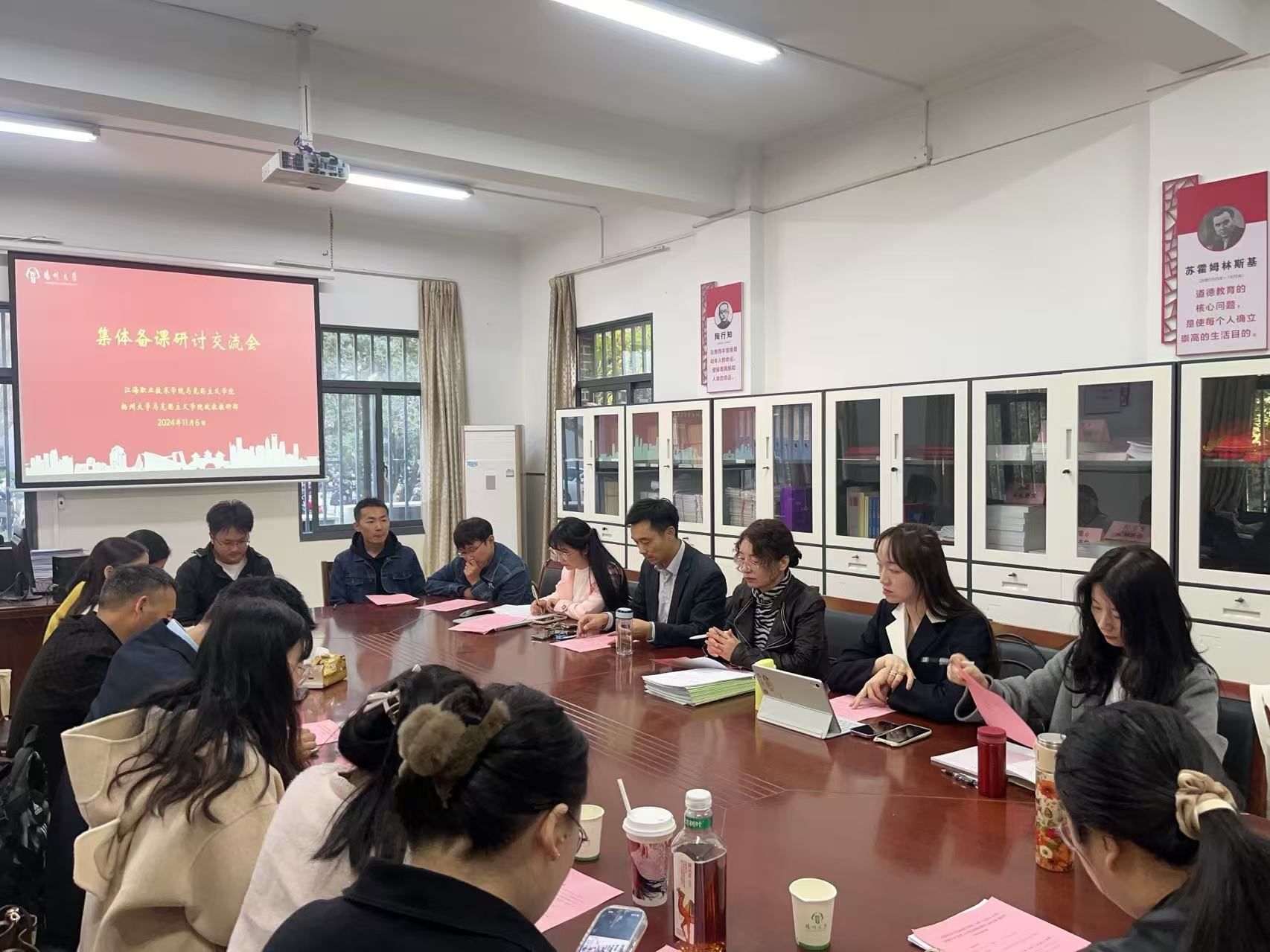 近日,我院思想政治教育专业教研部和江海职业技术学院基础教学部,在学院行政楼一楼101共同举行了集体备课交流研讨活动。院教研部主任杨丽娟、教研部支部书记朱益飞,江海职业技术学院基础教学部思修教研室主任翁紫萍、教科研中心主任奚春华、毛概教研室主任谭运启,院政教系教师和江海职业技术学院基础教学部教师参加了本次活动。