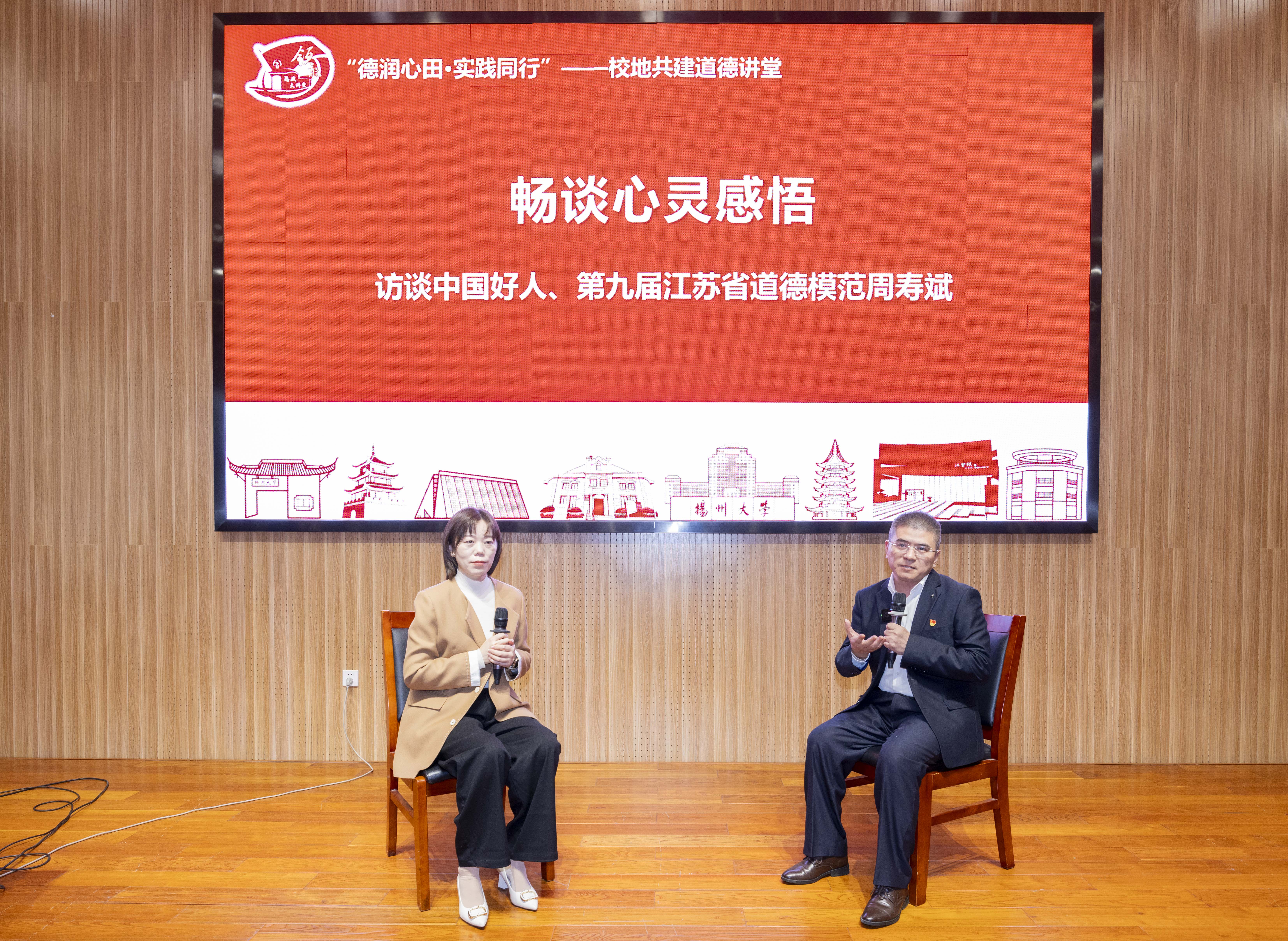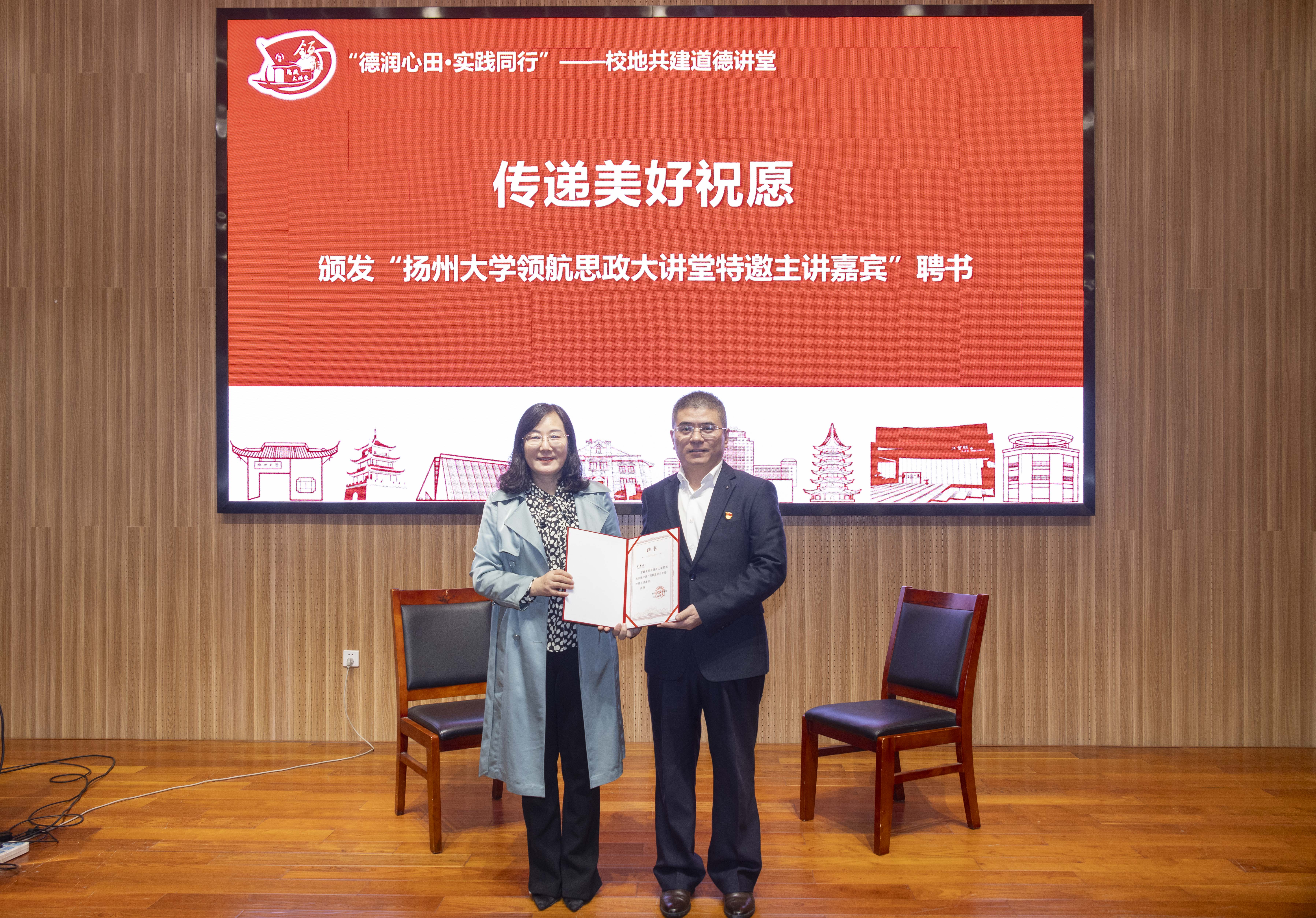 活动尾声,学院党委书记戴玉琴为周寿斌同志颁发“扬州大学领航思政大讲堂特邀主讲嘉宾”聘书,高邮市新时代文明实践中心主任张爱方发出活动倡议,期望同学们多向周寿斌同志学习,践行道德承诺,多做一件善事,为身边的人和社会带来更多的正能量和温暖。