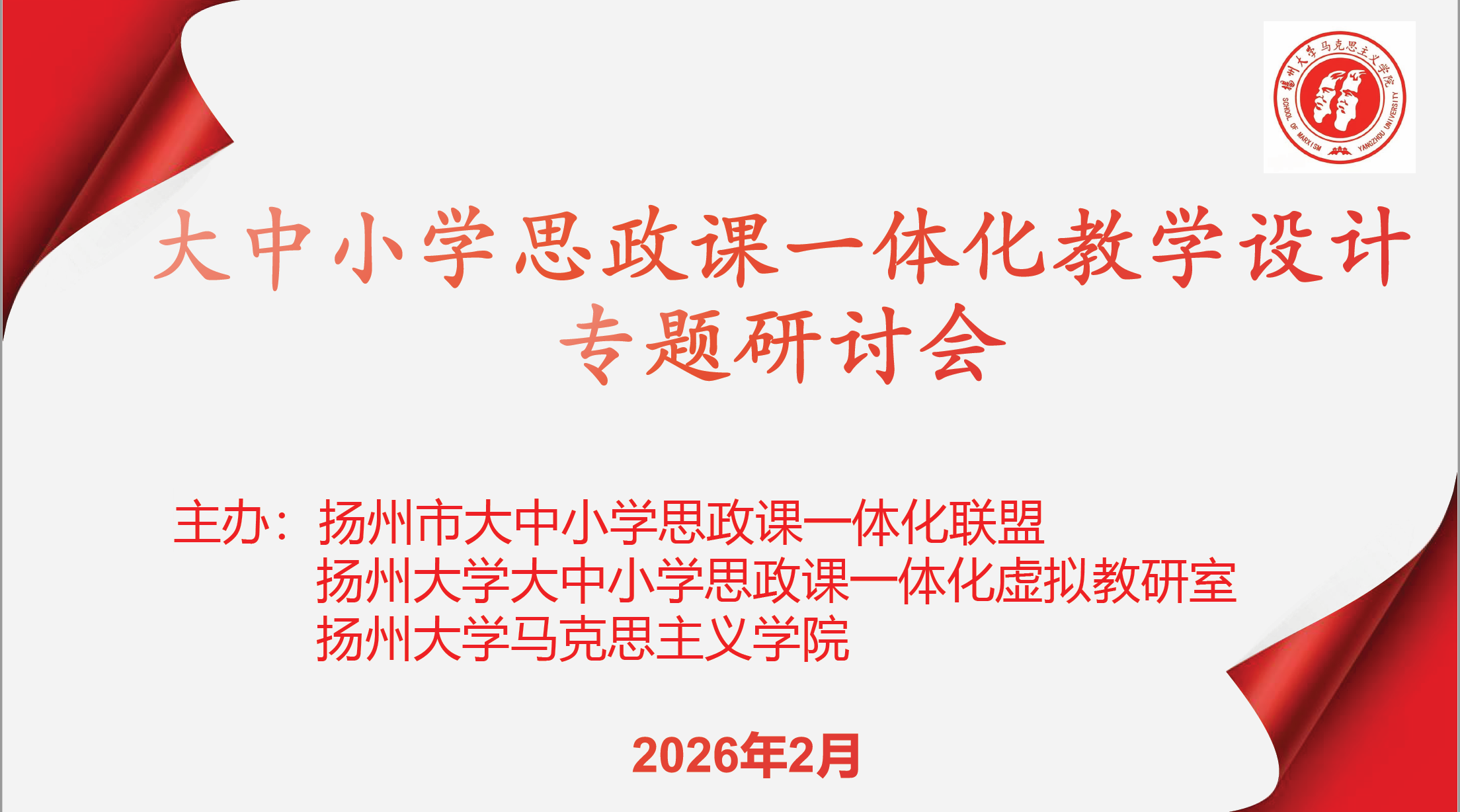 2月7日,由扬州市大中小学思政课一体化联盟、扬州大学大中小学思政课一体化虚拟教研室、扬州大学马克思主义学院联合主办的“大中小思政课一体化教学设计专题研讨会”顺利在线上召开。来自扬州大学、扬州市教育科学研究院、镇江市教学科学研究院以及扬州市、常州市、镇江市、淮安市、南通市等十余所大中小学的40余位专家参与了此次活动。会议由扬州大学马克思主义学院院长唐慧玲教授主持。
