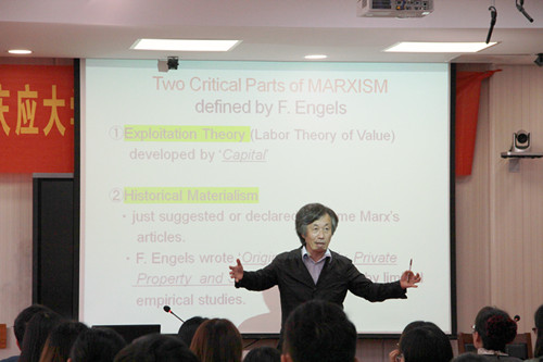 大西広教授首先介绍了日本庆应大学的历史、现状和崇尚学术自由的办学理念,勉励大家要敢于坚持自己的学术观点并欢迎我院研究生前去参观、学习。报告会上,大西広教授从劳动价值论和历史唯物主义角度,深入分析了工业革命之前封建制的必然性、资本主义的经济发展、工业革命以后的最优增长路径以及最优投资率等内容。大西広教授还从数量模型角度揭示了资本剥削劳动的秘密,指出,资本主义只是人类社会发展历史中的一个阶段;马克思主义是真理,至今仍然具有适用性和指导意义,必须加以坚持。