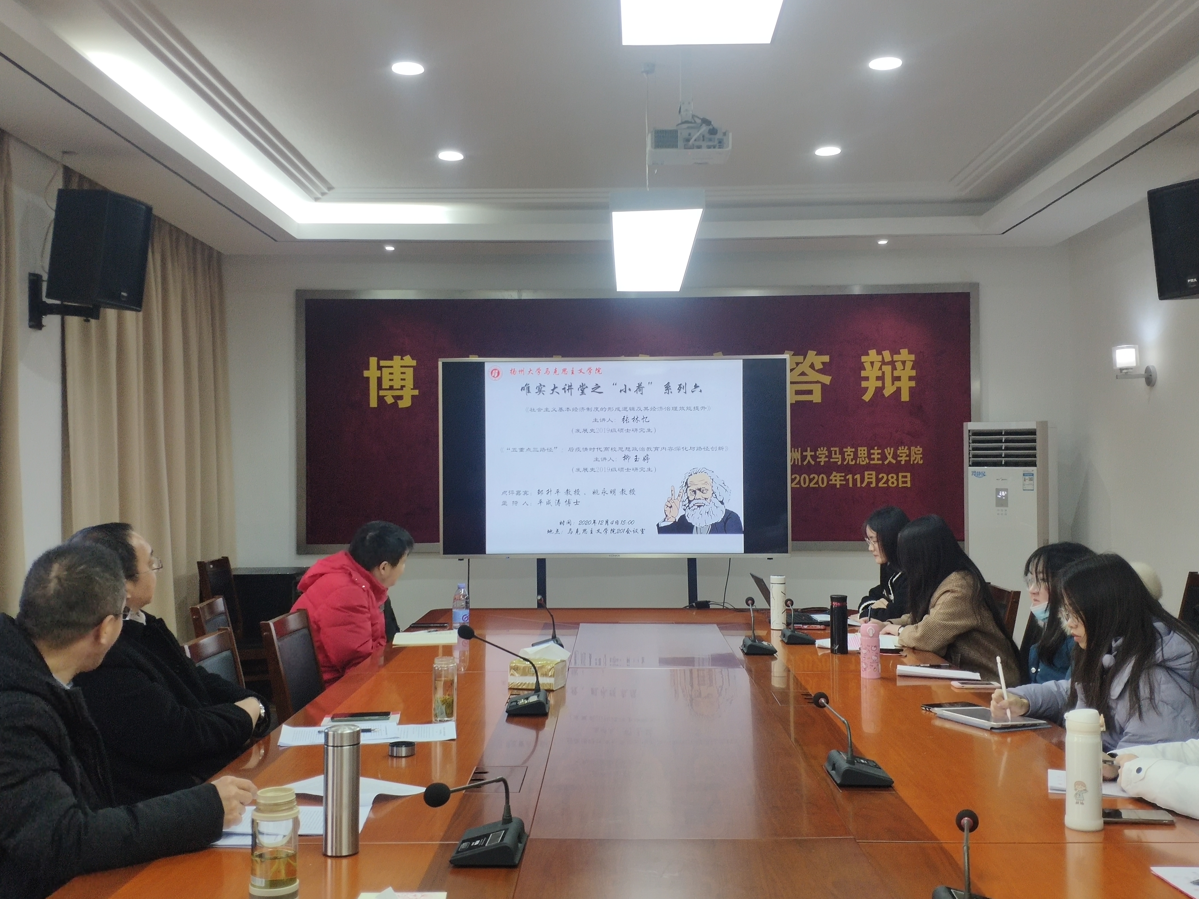 2020年12月4日下午15点,马克思主义发展史学科点在学院201会议室举办唯实大讲堂之“小荷”系列第六场学术报告会。本次报告的主讲人为2019级发展史硕士研究生张林忆、柳玉婷,邹升平教授和姚永明教授出席此次报告会担任点评嘉宾,平成涛老师主持本次报告。全体19级和20级马克思主义发展史硕士研究生参加了此次学术报告会。