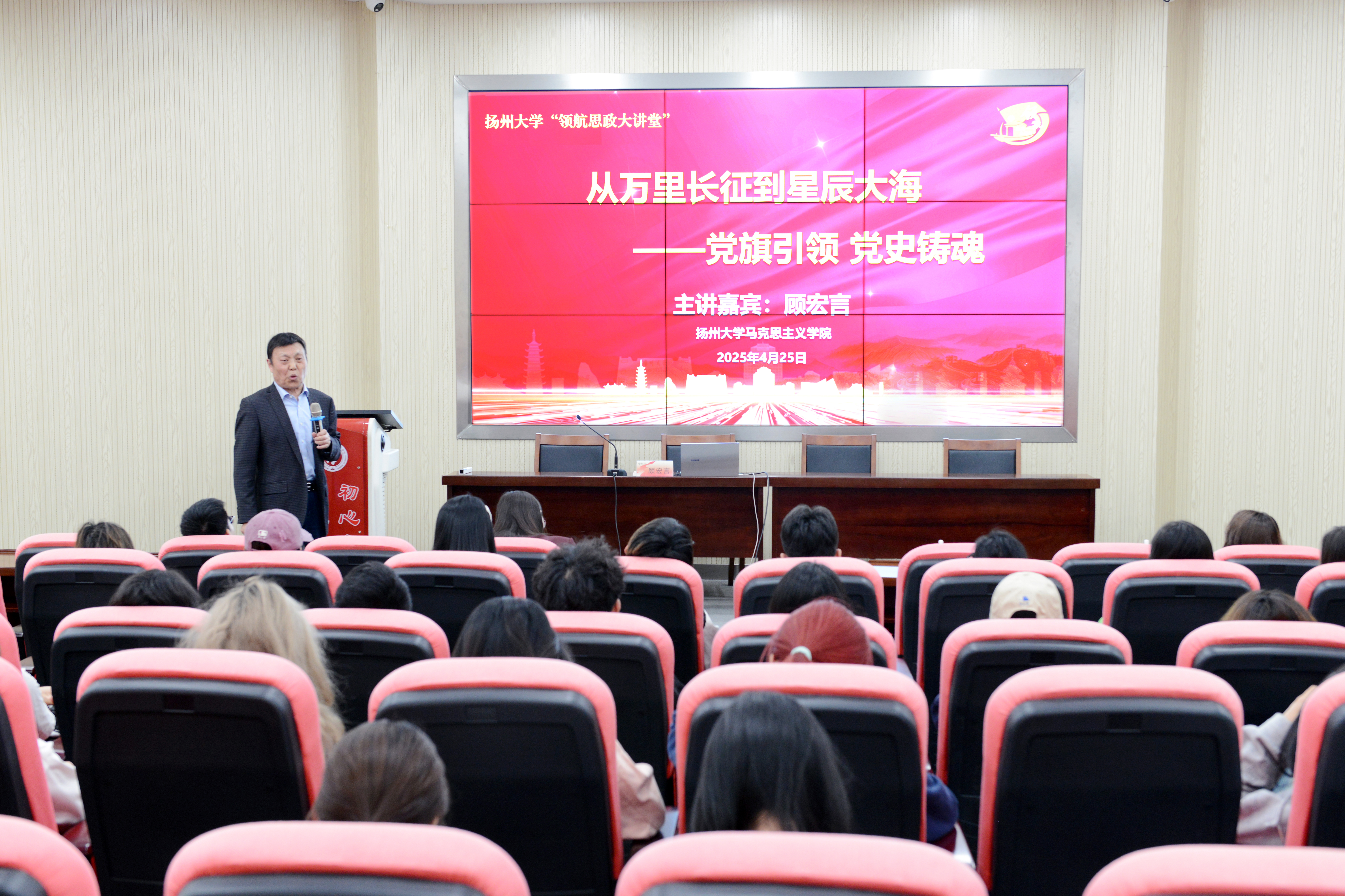 4月25日上午,扬州大学“领航思政大讲堂”邀请到原河海大学商学院党委书记、教授,上海交通大学客座教授顾宏言走进江阳路南校区的思政课堂,为美术与设计学院80余名青年学子上了一堂以“从万里长征到星辰大海——党旗引领 党史铸魂”为主题的思想政治理论课。