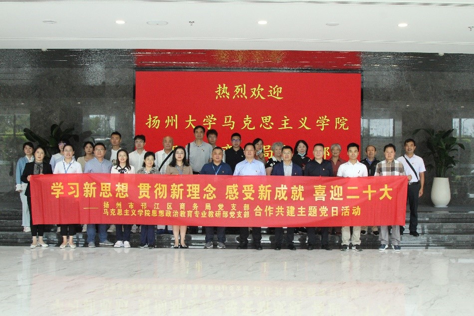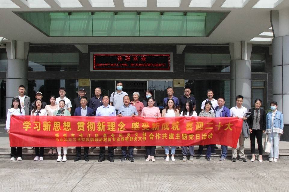 为深入学习习近平新时代中国特色社会主义思想,领悟新时代发展新理念,切身感受新时代党的伟大新成就,以神采昂扬的精神面貌喜迎党的二十大胜利召开,9月21日,学院思想政治教育专业教研部党支部和扬州市邗江区商务局党支部共同开展“学习新思想,贯彻新理念,感受新成就,喜迎二十大”主题党日活动。邗江区区级机关工委书记马在干,邗江区商务局党组成员、副局长杜顺利,学院党委书记刘继平等出席参加主题党日活动。