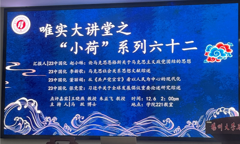 12月6日14点00分,由马克思主义中国化学科点主办的唯实大讲堂“小荷”系列第六十四期学术交流活动在学院221教室如期举行。活动中,王晓燕和朱益飞教授受邀出席并发表细致点评。马跃博士担任此次活动的主持人,马克思主义中国化学科点2023级、2024级全体硕士研究生参与。