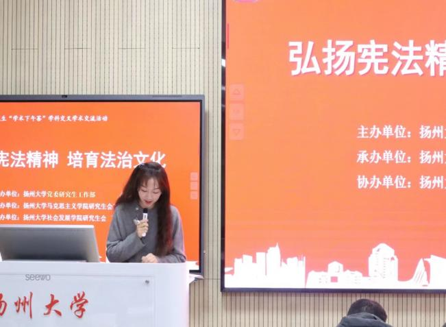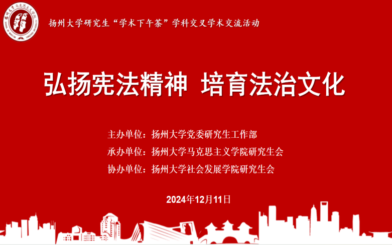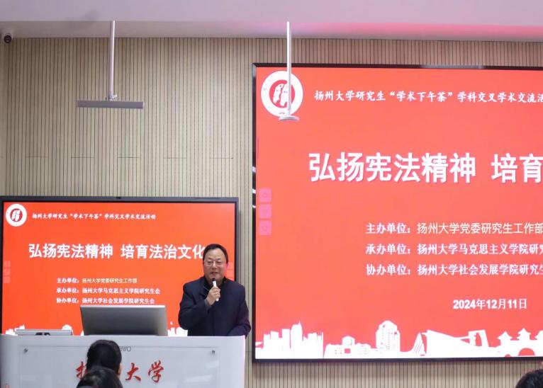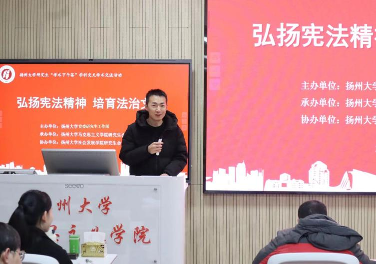 12月11日下午,扬州大学第七十五期研究生“学术下午茶”学科交叉学术交流活动在江阳路南校区教学楼701成功举办。本次活动以“弘扬宪法精神,培育法治文化”为主题,聚焦法学、政治学、历史学以及教育学等前沿研究领域,通过跨学科的学术交流和探讨,旨在加强研究生对建设法治国家的理解与掌握,在跨学科的平台上互相启发、学习和借鉴,共同推动学术的进步与创新。