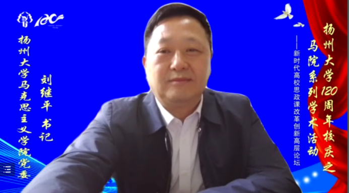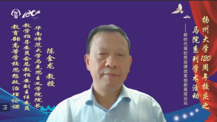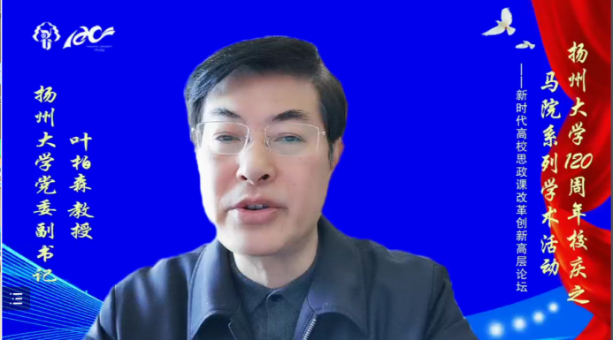 4月16日,由学院和教育部高校思想政治工作队伍培训研修中心(扬州大学基地)、江苏省中国特色社会主义理论体系研究中心(扬州大学基地)联合主办的新时代高校思想政治理论课改革创新高层论坛在线举行。教育部高等学校思想政治理论课教学指导委员会总教指委副主任委员、华南师范大学陈金龙教授,校党委副书记叶柏森教授出席会议并致开幕辞。