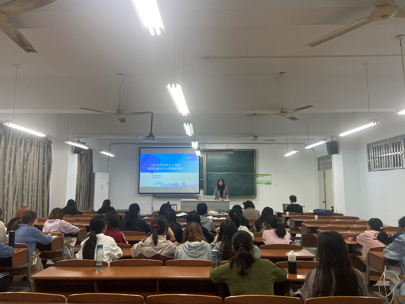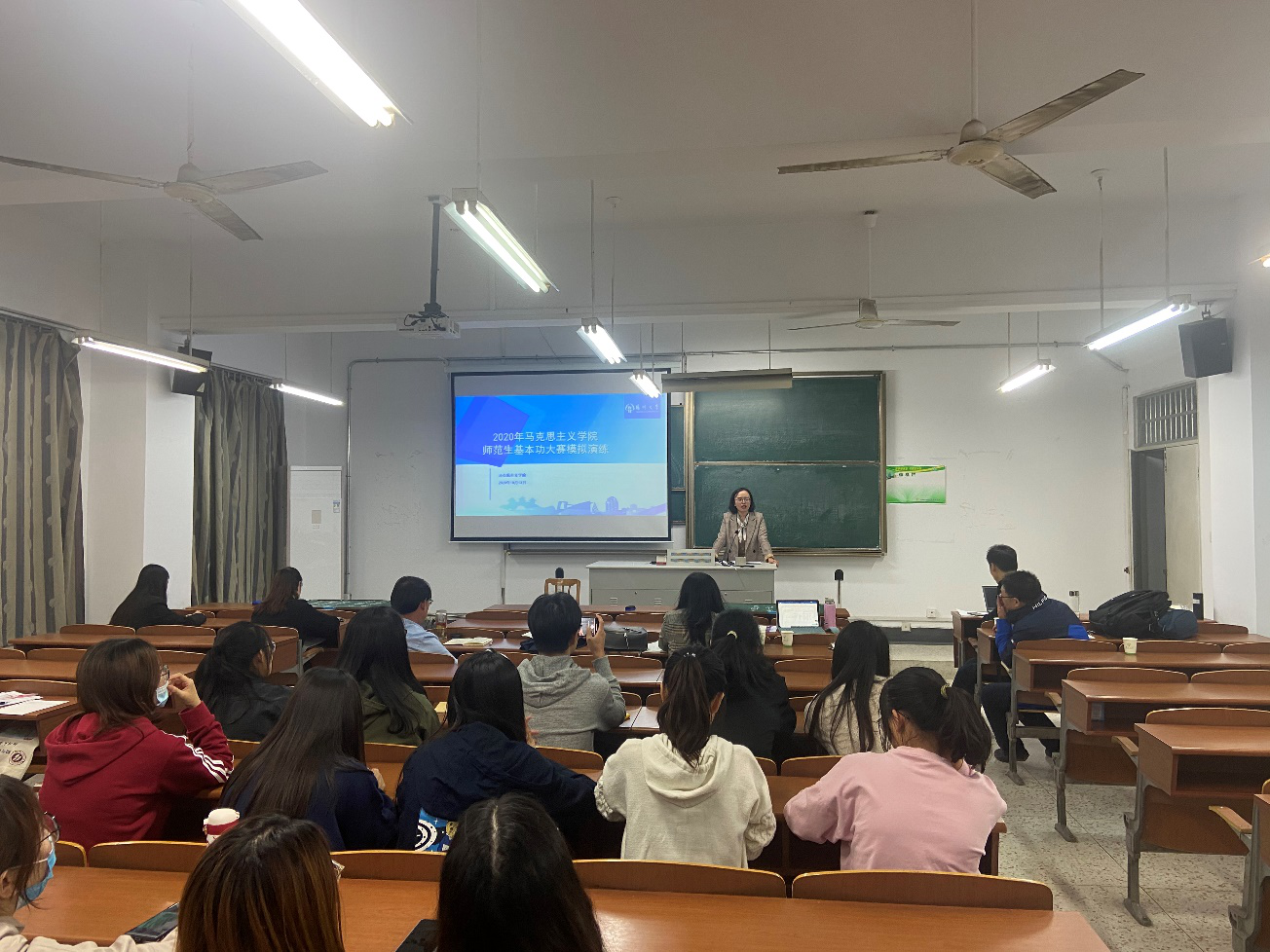2020年10月13日晚,政教教研部举办“2020年省师范生基本功大赛模拟演练”,参加演练的选手为即将参加第九届江苏省师范生基本功大赛的同学。本次演练邀请了梅岭中学李敏和新华中学吕娟老师担任校外指导老师,政教教研部教师吴锋、唐慧玲、朱益飞、闾彬、王雪婷老师担任校内指导老师,部分思想政治教育专业(师范)本科生和学科教学(思政)专业硕士生前来观摩。