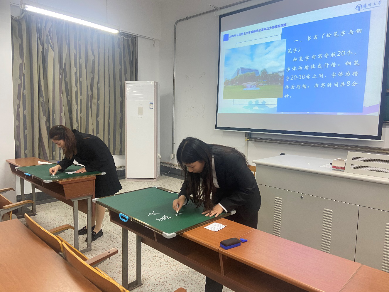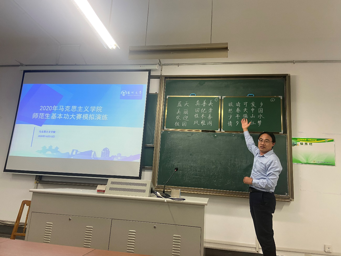模拟演练流程依照省师范生基本功大赛中的通用技能比赛进行,共分为三个部分:书写(粉笔字和钢笔字)、口语表达和模拟授课。模拟赛结束后,校内、校外两位选手的表现进行了细致的点评并预祝二人在正式比赛中取得佳绩。